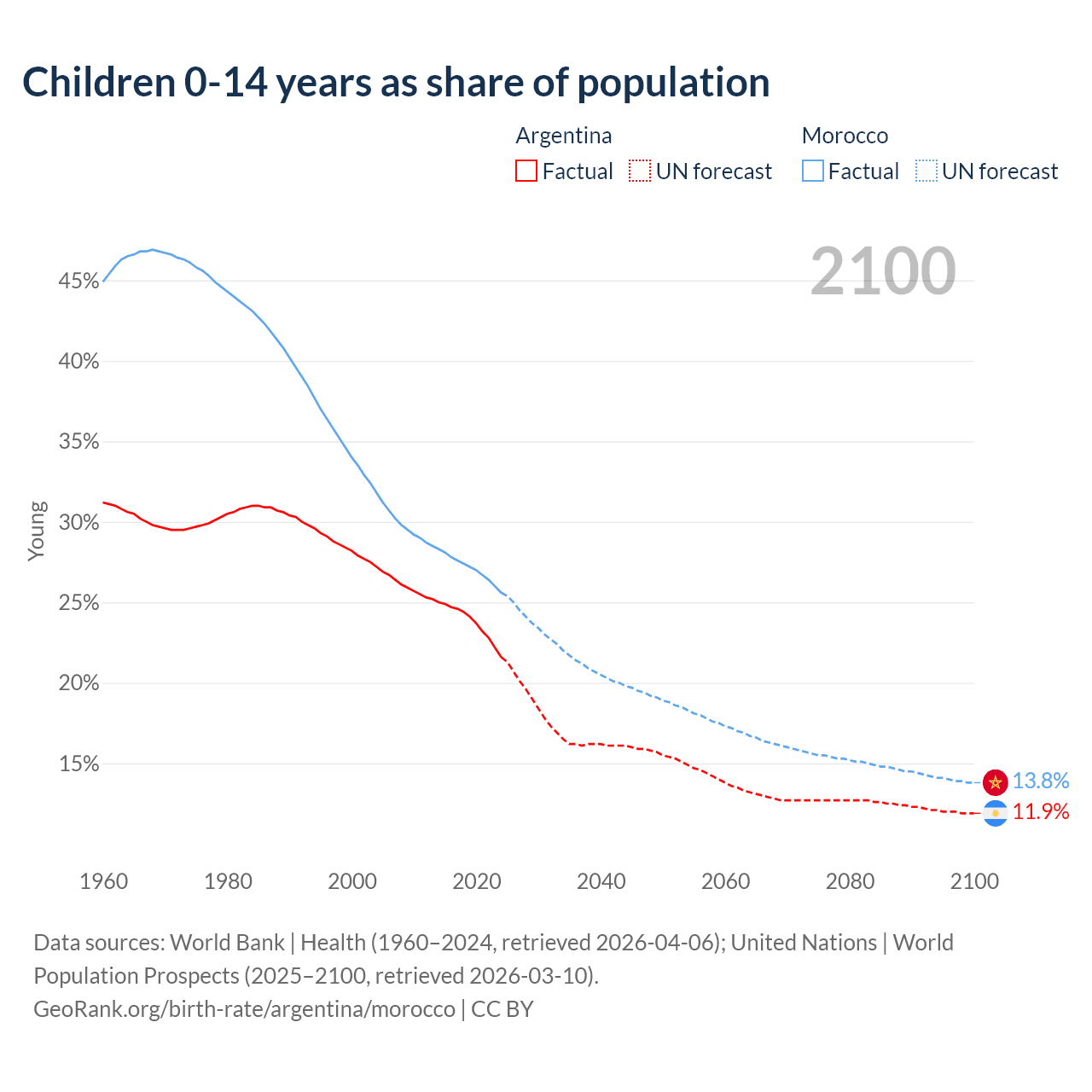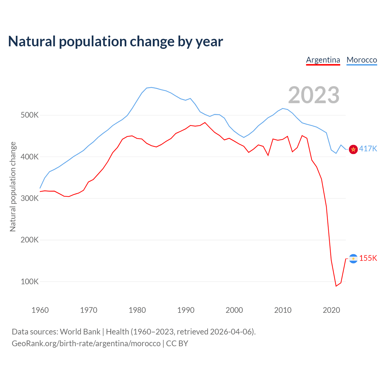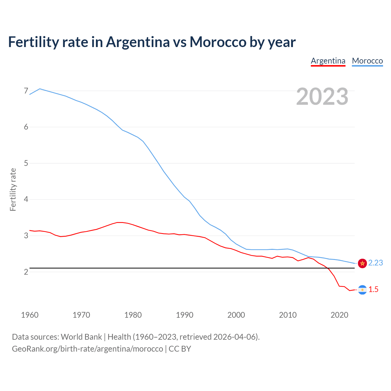 According to the latest available data on birth rates, the fertility rate in Argentina was 1.5 children per woman in 2023, compared to 2.23 in Morocco in 2023. The replacement level is considered to be 2.1 children per woman.