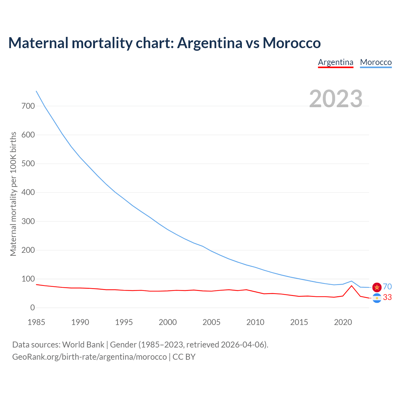 The maternal mortality rate, which is the probability of dying during childbirth or within 42 days of pregnancy termination, is 33 deaths per 100,000 live births in Argentina, compared to 70 deaths in Morocco.