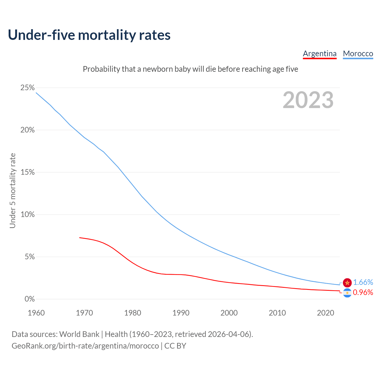 The chance that a newborn baby will die before reaching age five is 0.96% in Argentina and 1.66% in Morocco. Above is a chart with historical data on under-five mortality rates.
