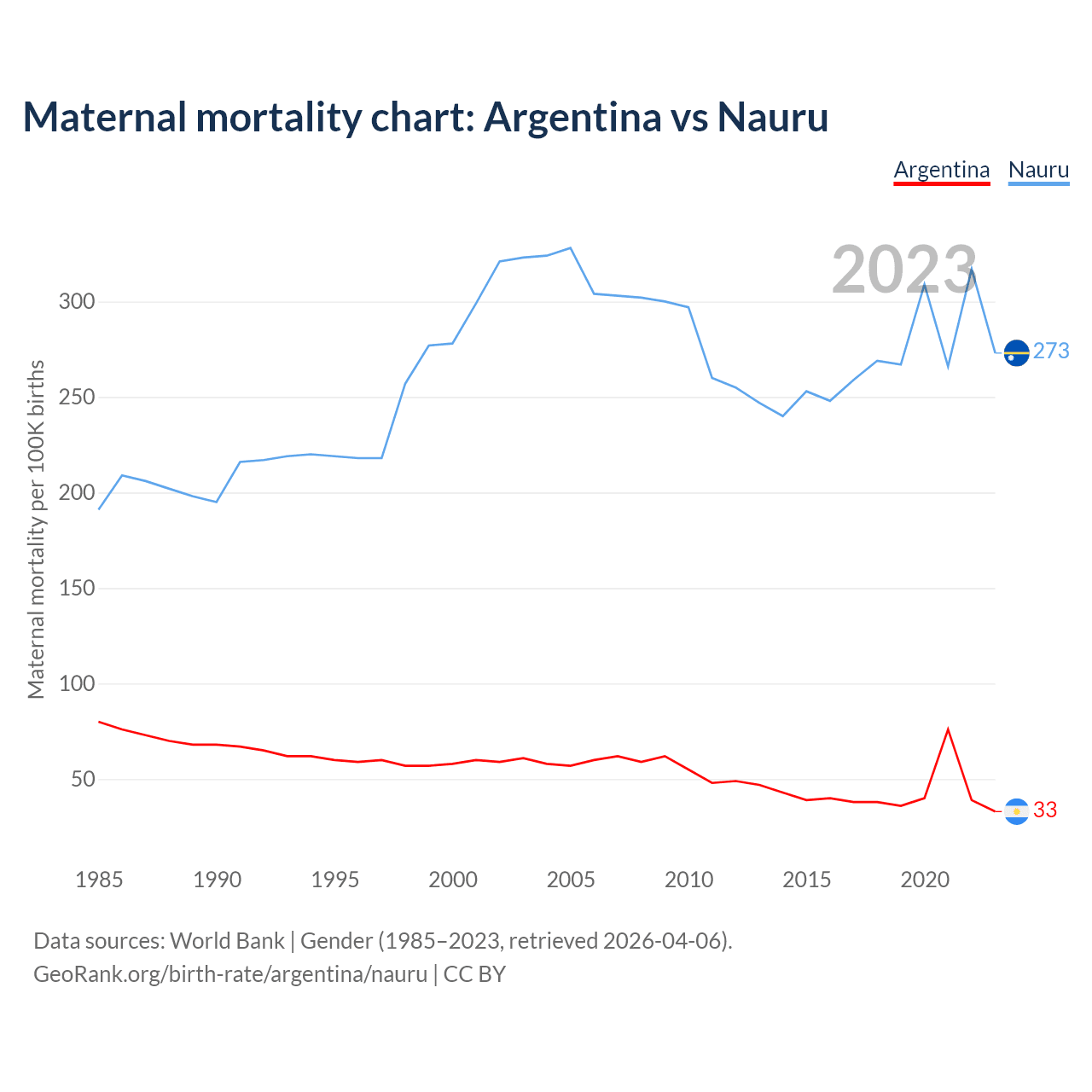 The maternal mortality rate, which is the probability of dying during childbirth or within 42 days of pregnancy termination, is 33 deaths per 100,000 live births in Argentina, compared to 273 deaths in Nauru.
