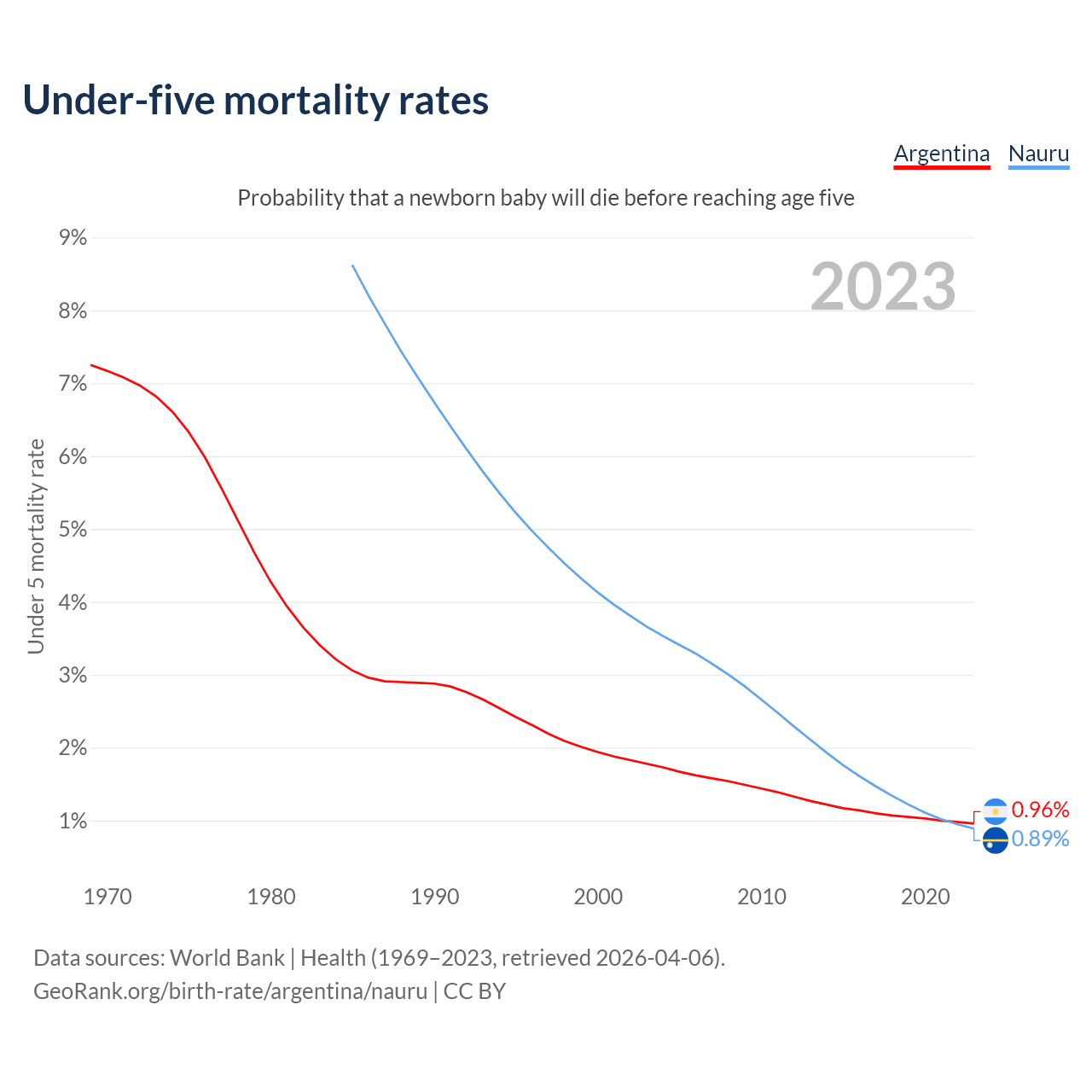 The chance that a newborn baby will die before reaching age five is 0.96% in Argentina and 0.89% in Nauru. Above is a chart with historical data on under-five mortality rates.