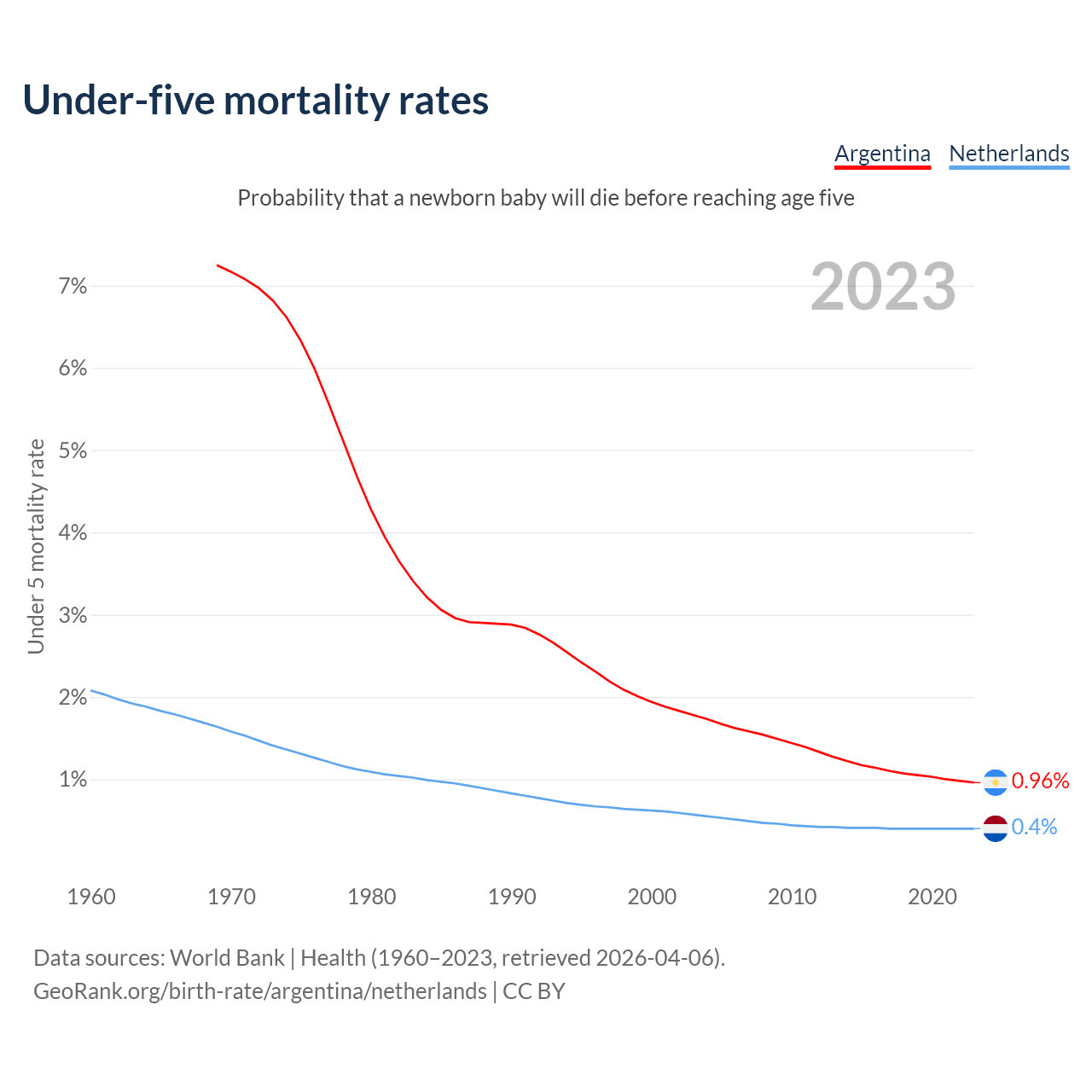 The chance that a newborn baby will die before reaching age five is 0.96% in Argentina and 0.4% in the Netherlands. Above is a chart with historical data on under-five mortality rates.