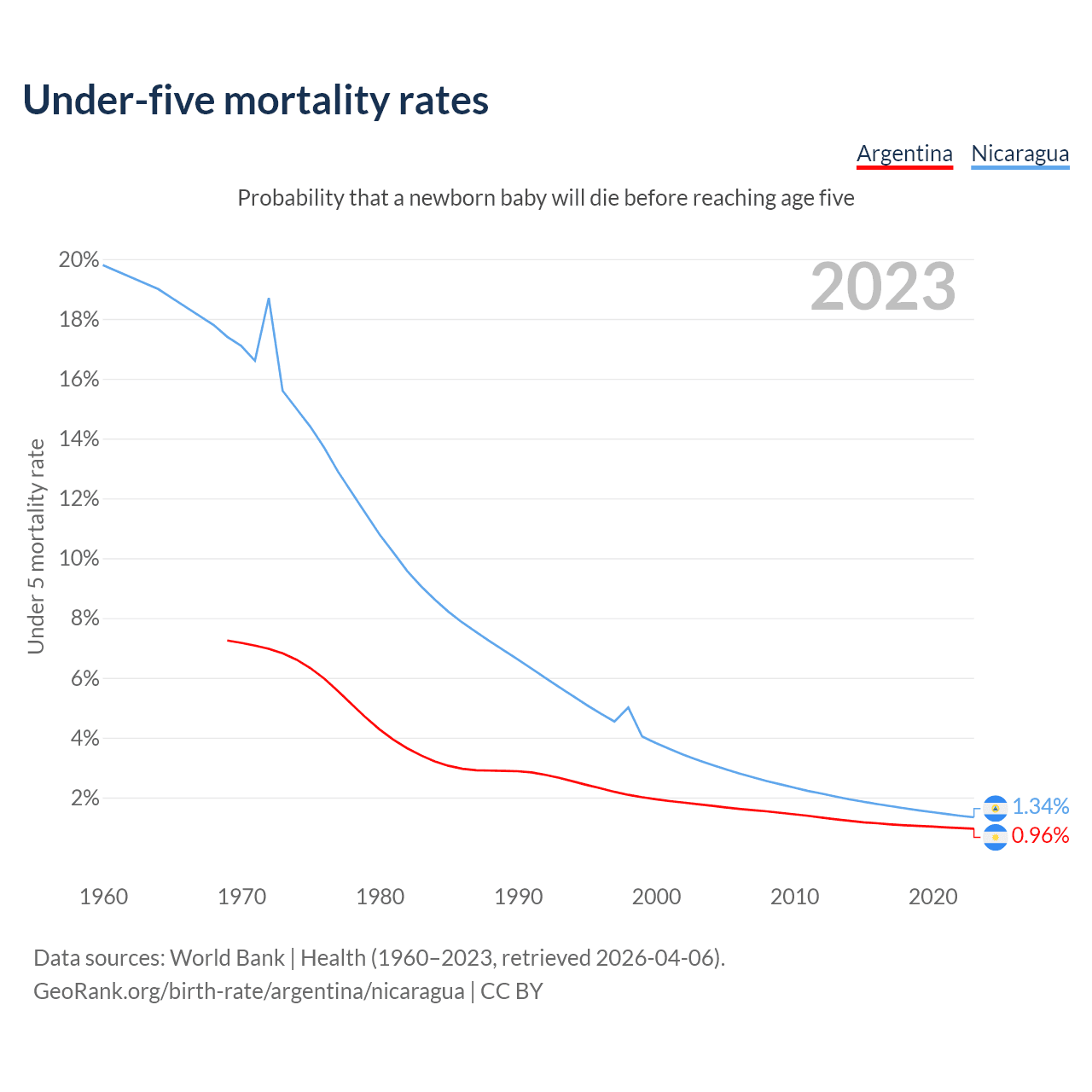 The chance that a newborn baby will die before reaching age five is 0.96% in Argentina and 1.34% in Nicaragua. Above is a chart with historical data on under-five mortality rates.
