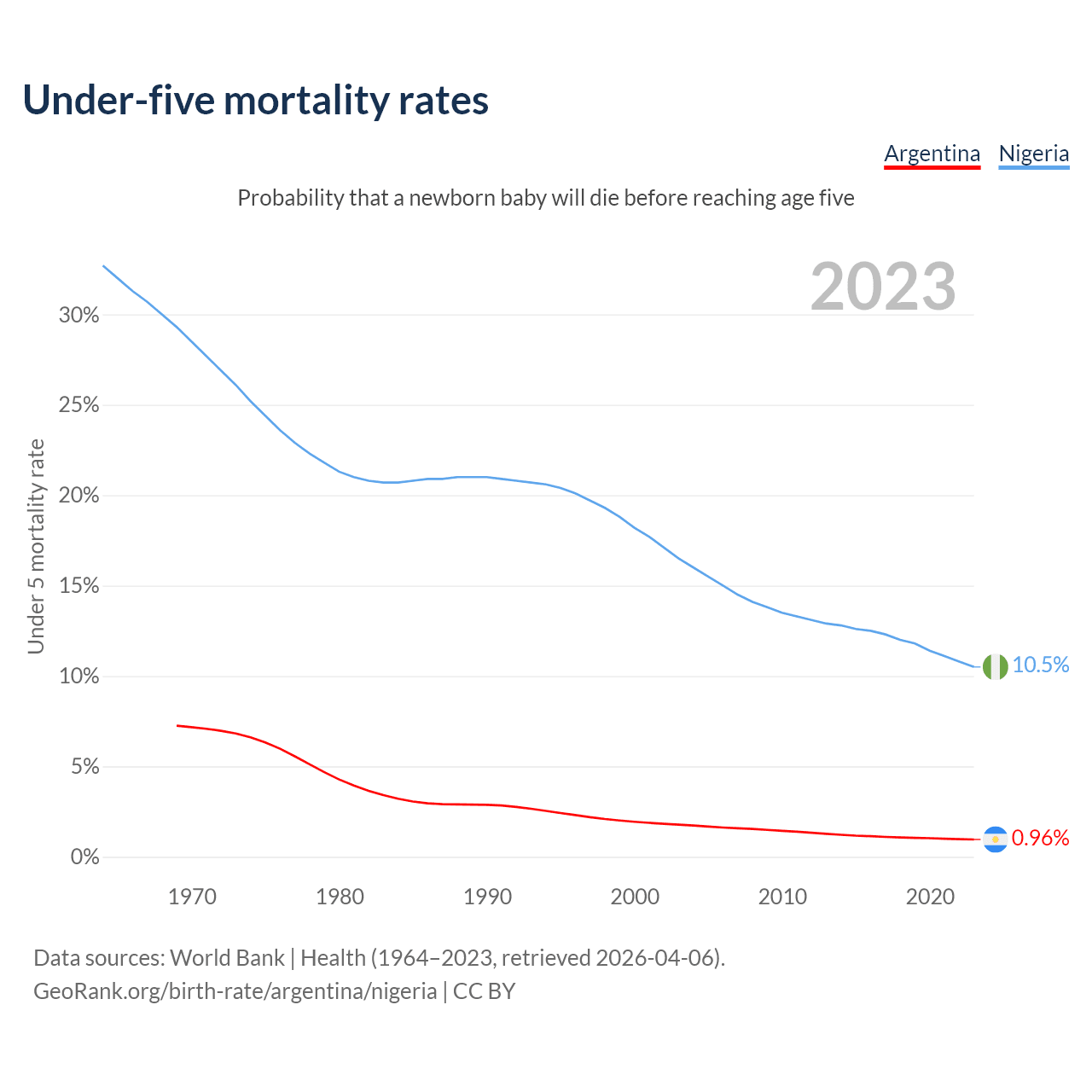 The chance that a newborn baby will die before reaching age five is 0.96% in Argentina and 10.5% in Nigeria. Above is a chart with historical data on under-five mortality rates.