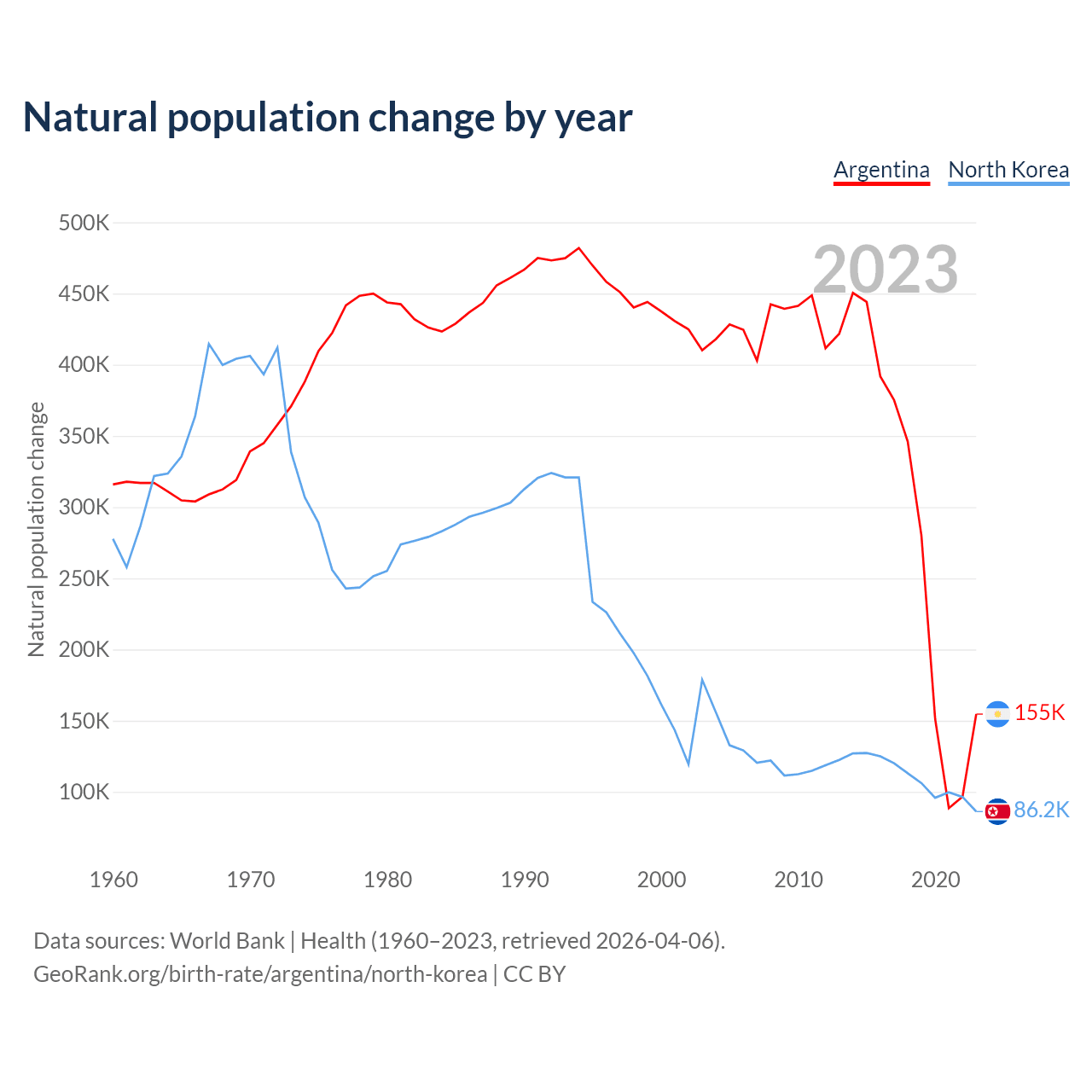 Argentina has an annual birth rate of 11.1 births per 1,000 people, compared to 12.9 for North Korea. The average number of children a woman is expected to have during her lifetime — the fertility rate, is 1.5 in Argentina and 1.78 in North Korea — 18.7% difference.