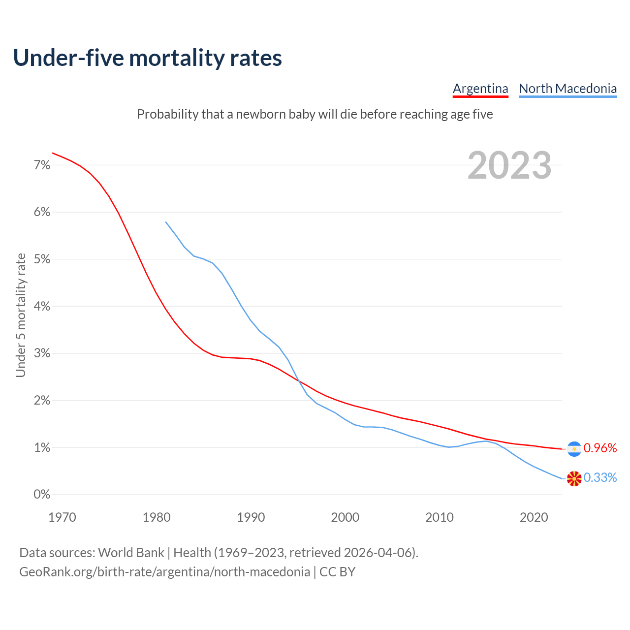 The chance that a newborn baby will die before reaching age five is 0.96% in Argentina and 0.33% in North Macedonia. Above is a chart with historical data on under-five mortality rates.