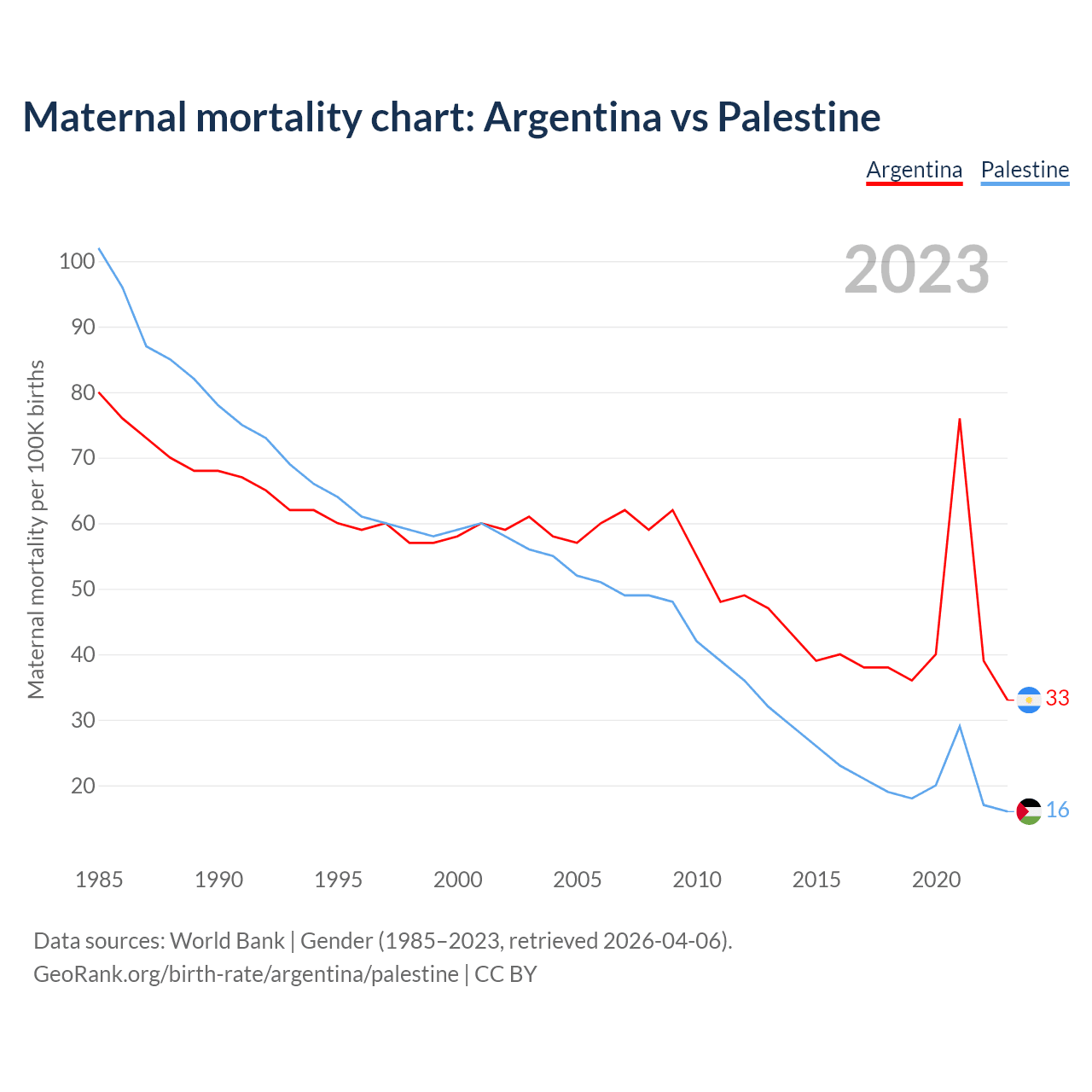 The maternal mortality rate, which is the probability of dying during childbirth or within 42 days of pregnancy termination, is 33 deaths per 100,000 live births in Argentina, compared to 16 deaths in Palestine.