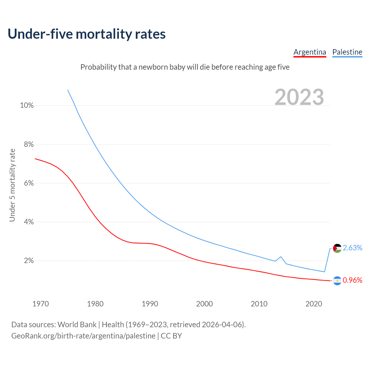 The chance that a newborn baby will die before reaching age five is 0.96% in Argentina and 2.63% in Palestine. Above is a chart with historical data on under-five mortality rates.