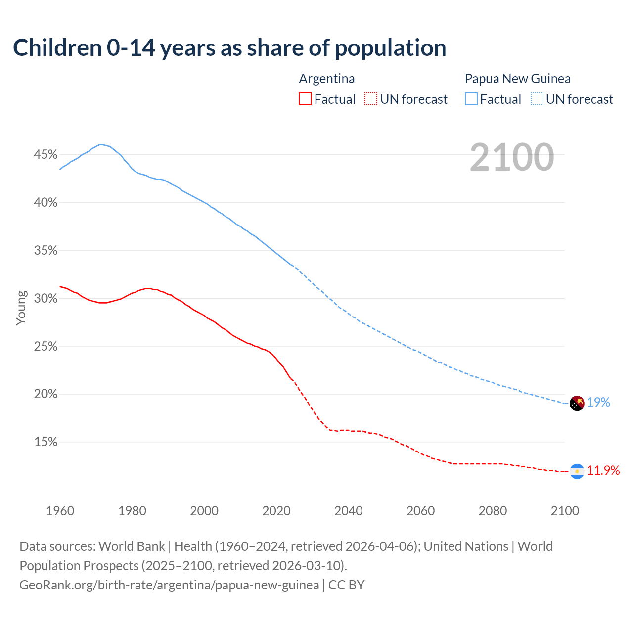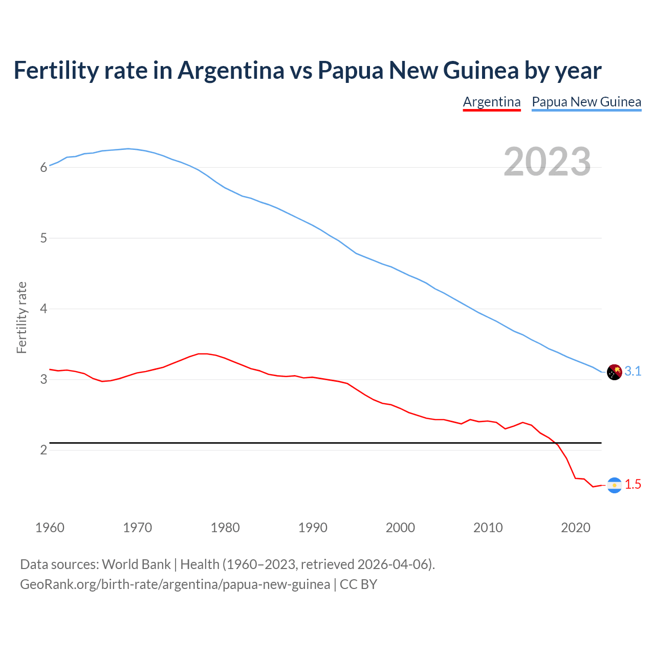 According to the latest available data on birth rates, the fertility rate in Argentina was 1.5 children per woman in 2023, compared to 3.1 in Papua New Guinea in 2023. The replacement level is considered to be 2.1 children per woman.