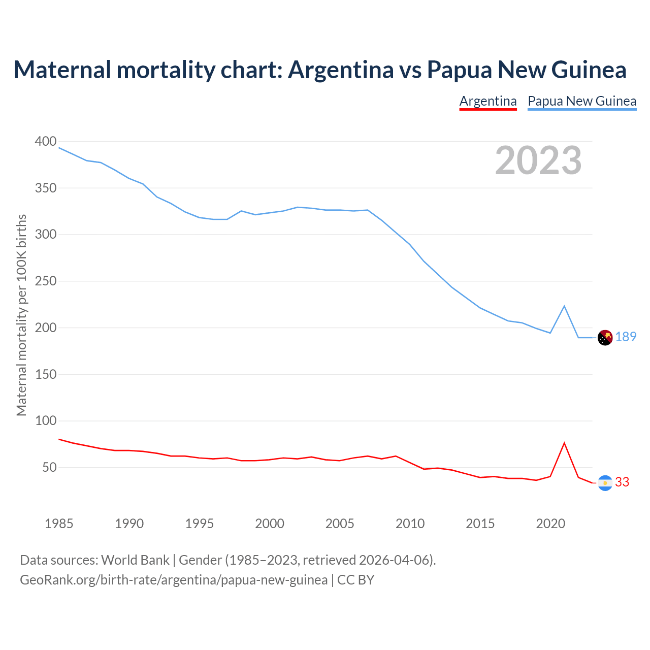 The maternal mortality rate, which is the probability of dying during childbirth or within 42 days of pregnancy termination, is 33 deaths per 100,000 live births in Argentina, compared to 189 deaths in Papua New Guinea.