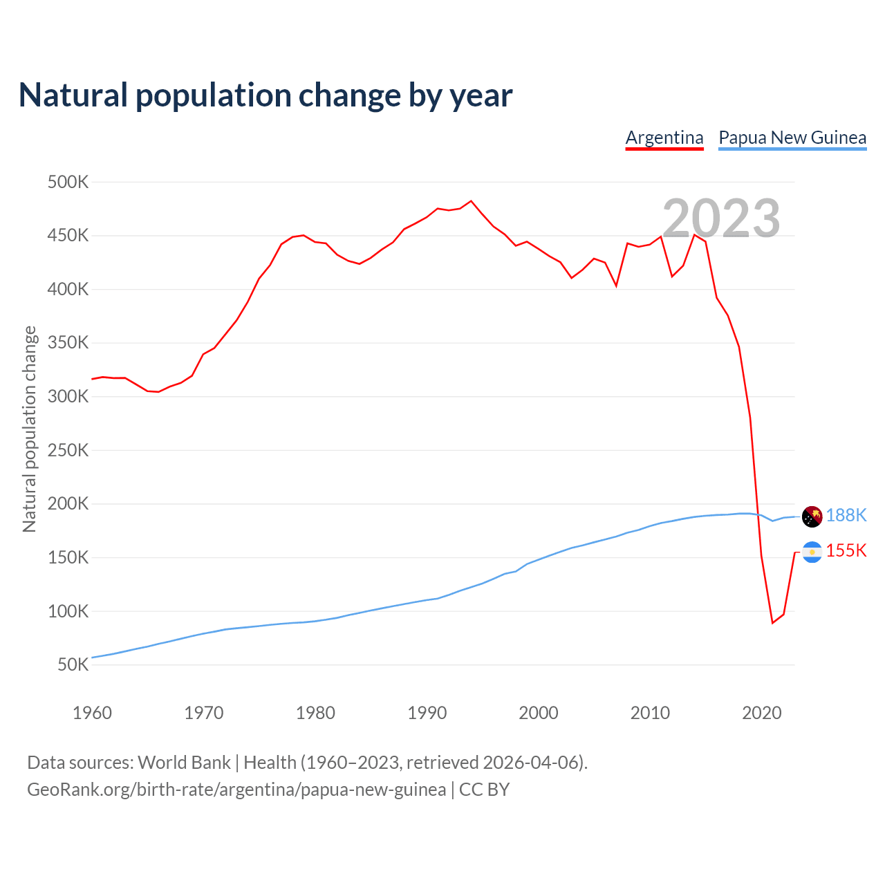 Argentina has an annual birth rate of 11.1 births per 1,000 people, compared to 24.6 for Papua New Guinea. The average number of children a woman is expected to have during her lifetime — the fertility rate, is 1.5 in Argentina and 3.1 in Papua New Guinea — 106.6% difference.