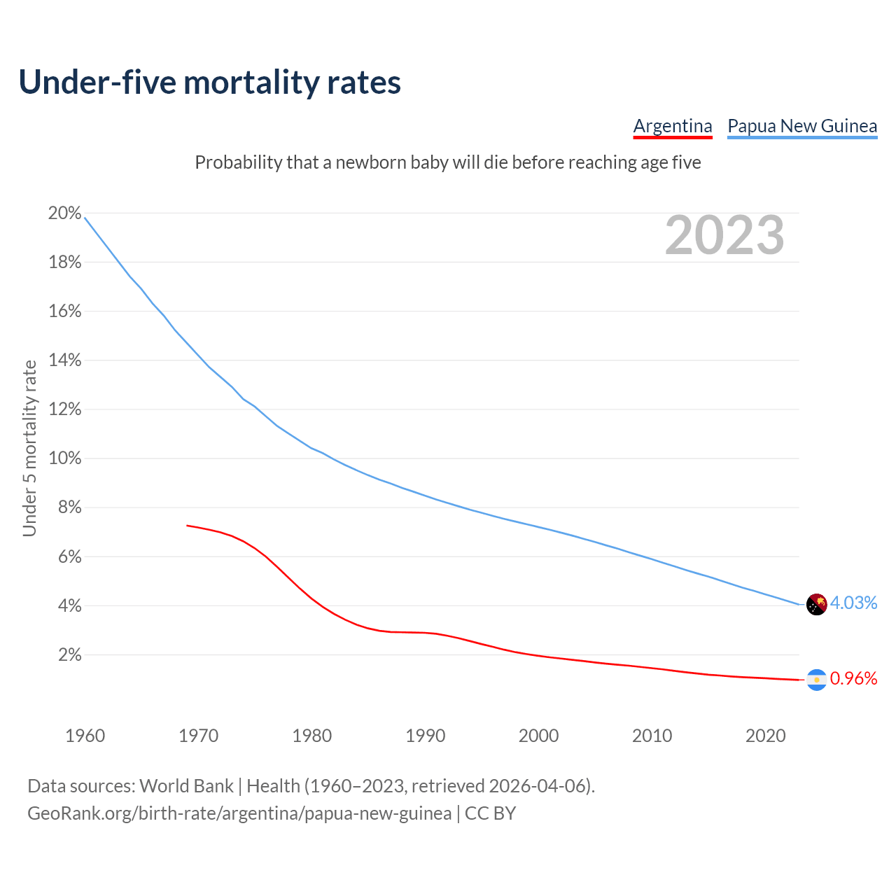 The chance that a newborn baby will die before reaching age five is 0.96% in Argentina and 4.03% in Papua New Guinea. Above is a chart with historical data on under-five mortality rates.