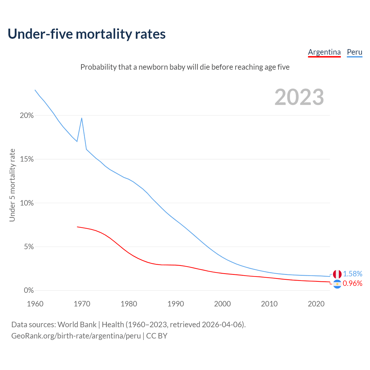 The chance that a newborn baby will die before reaching age five is 0.96% in Argentina and 1.58% in Peru. Above is a chart with historical data on under-five mortality rates.
