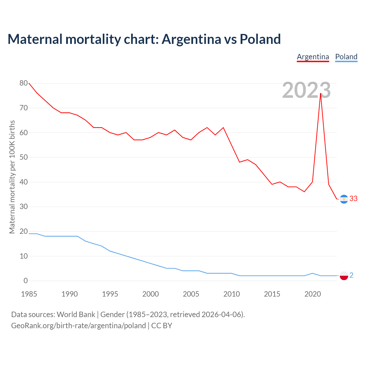 The maternal mortality rate, which is the probability of dying during childbirth or within 42 days of pregnancy termination, is 33 deaths per 100,000 live births in Argentina, compared to 2 deaths in Poland.