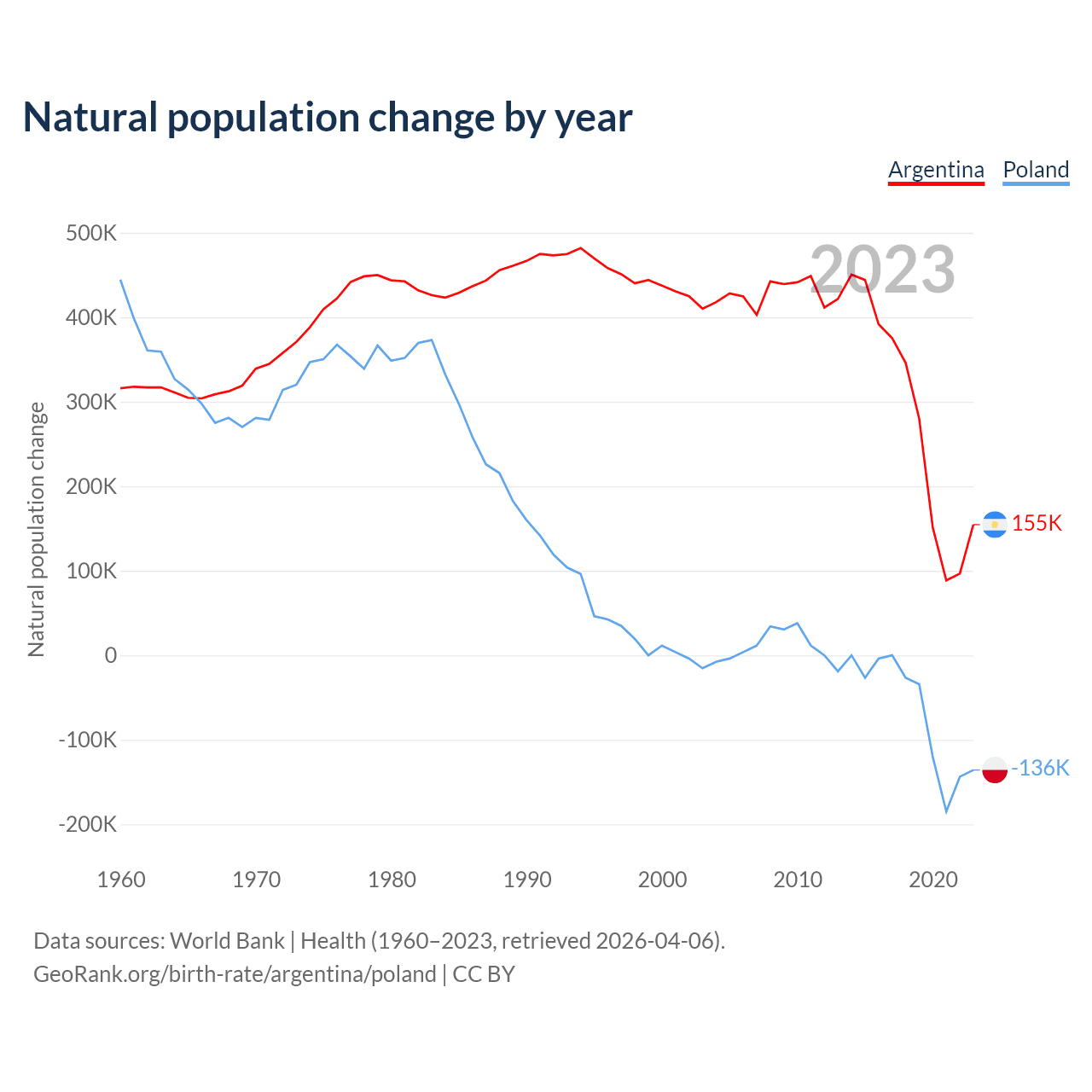 According to the latest available data on birth rates, the fertility rate in Argentina was 1.5 children per woman in 2023, compared to 1.16 in Poland in 2023. The replacement level is considered to be 2.1 children per woman.