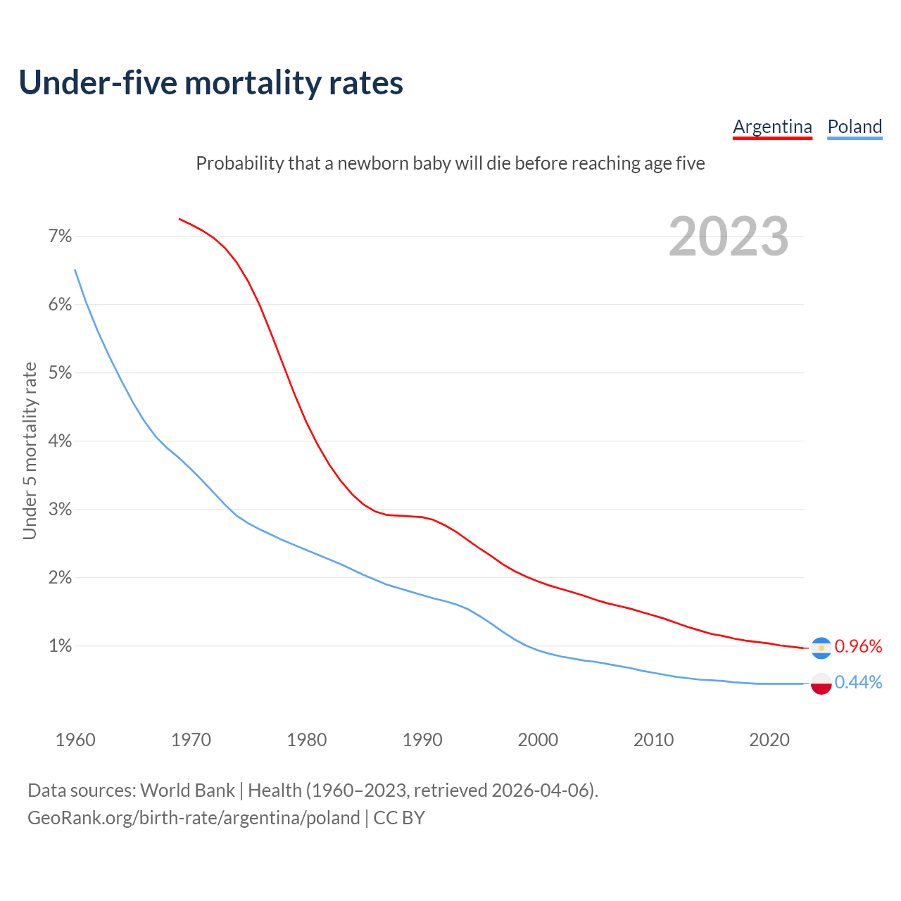 The chance that a newborn baby will die before reaching age five is 0.96% in Argentina and 0.44% in Poland. Above is a chart with historical data on under-five mortality rates.