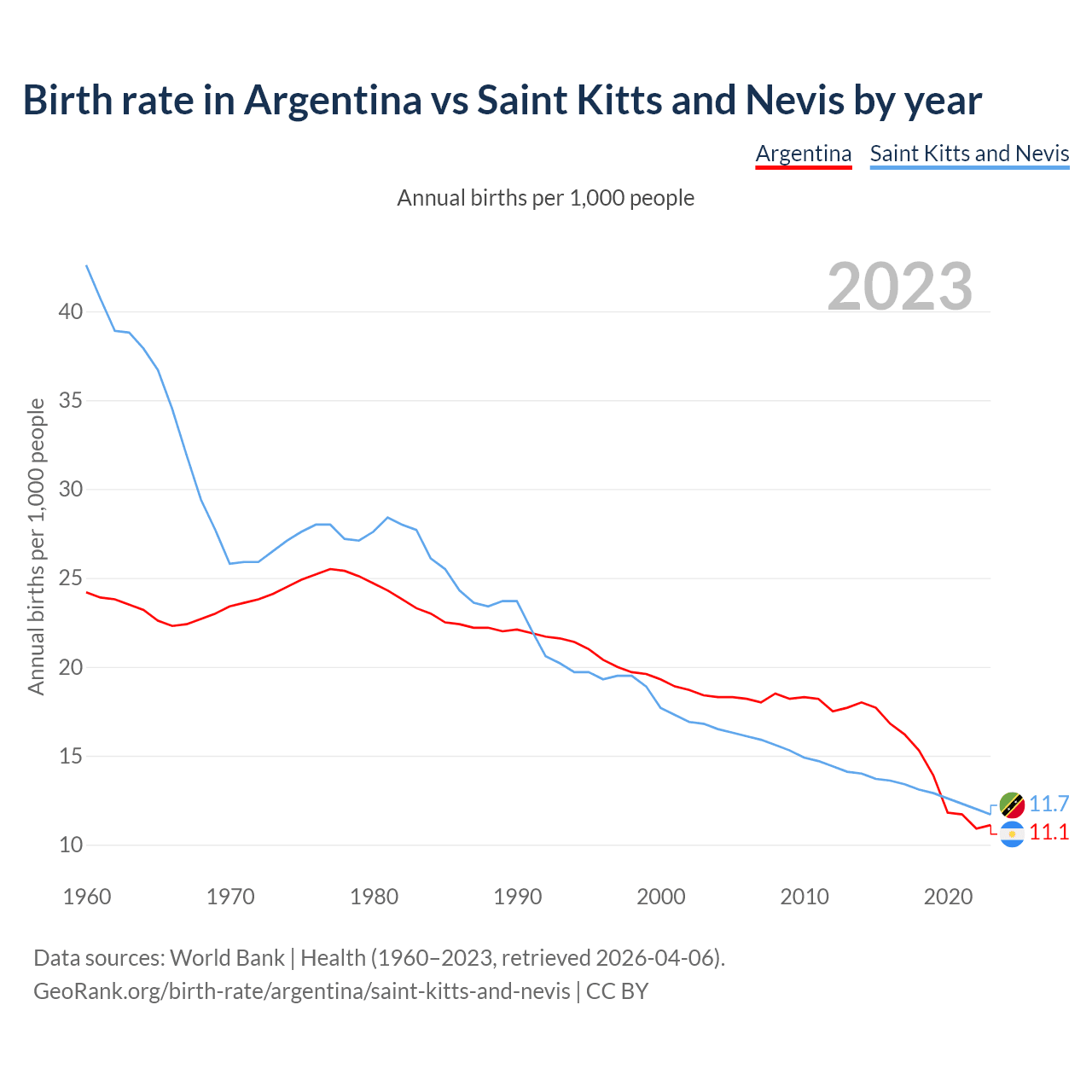 Argentina has an annual birth rate of 11.1 births per 1,000 people, compared to 11.7 for Saint Kitts and Nevis. The average number of children a woman is expected to have during her lifetime — the fertility rate, is 1.5 in Argentina and 1.51 in Saint Kitts and Nevis — 0.33% difference.