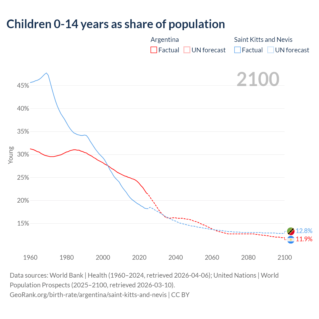 According to the latest available data on birth rates, the fertility rate in Argentina was 1.5 children per woman in 2023, compared to 1.51 in Saint Kitts and Nevis in 2023. The replacement level is considered to be 2.1 children per woman.