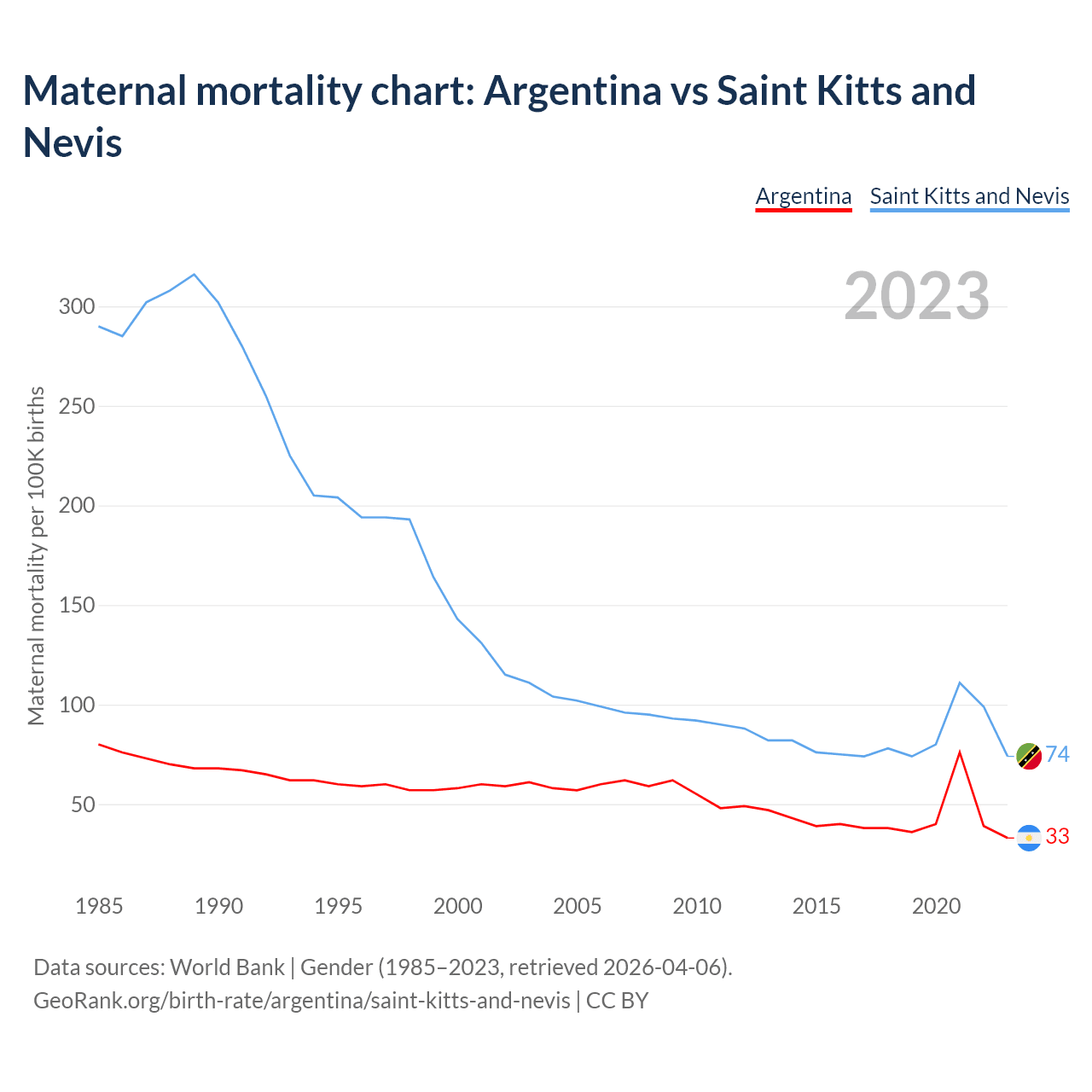 The maternal mortality rate, which is the probability of dying during childbirth or within 42 days of pregnancy termination, is 33 deaths per 100,000 live births in Argentina, compared to 74 deaths in Saint Kitts and Nevis.
