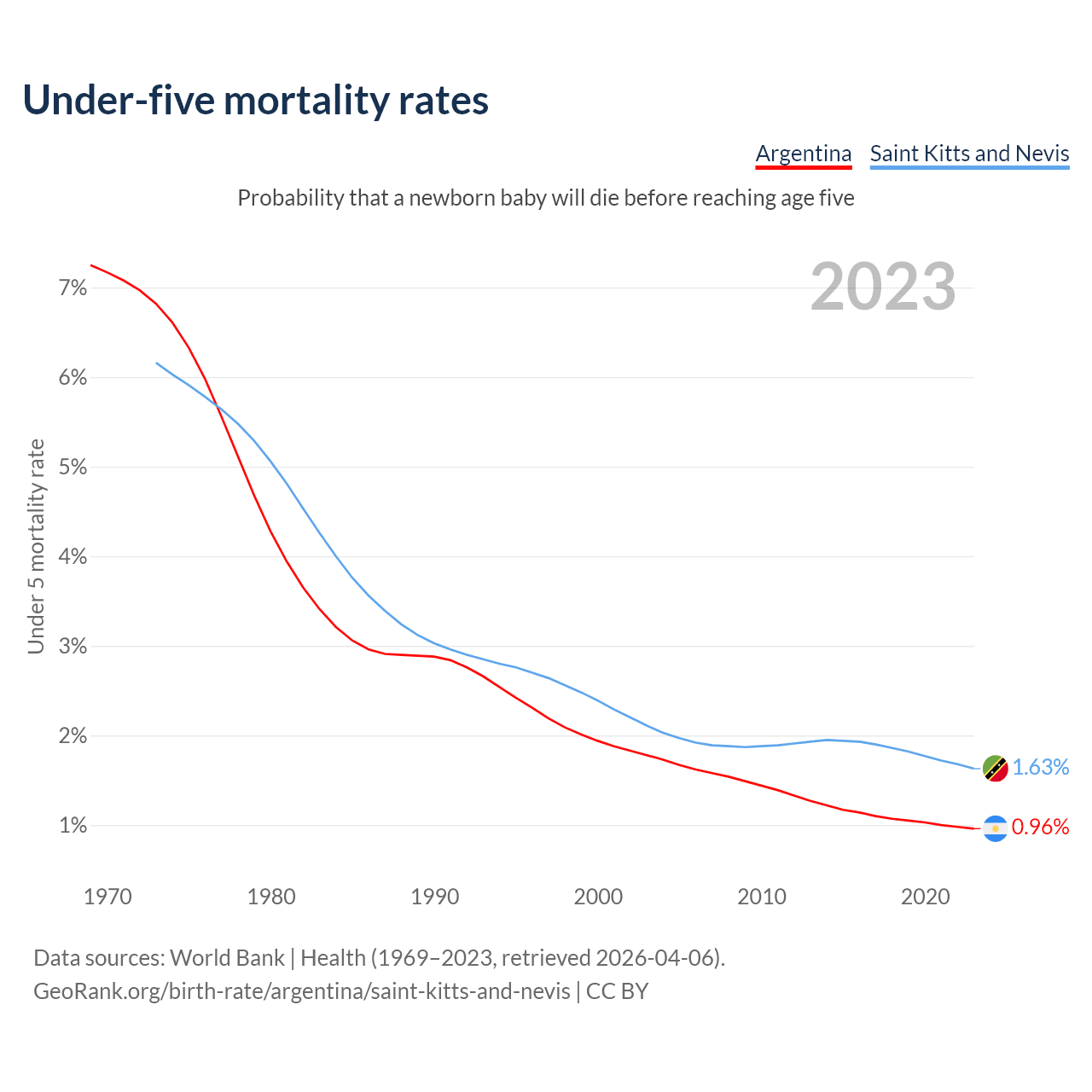 The chance that a newborn baby will die before reaching age five is 0.96% in Argentina and 1.63% in Saint Kitts and Nevis. Above is a chart with historical data on under-five mortality rates.