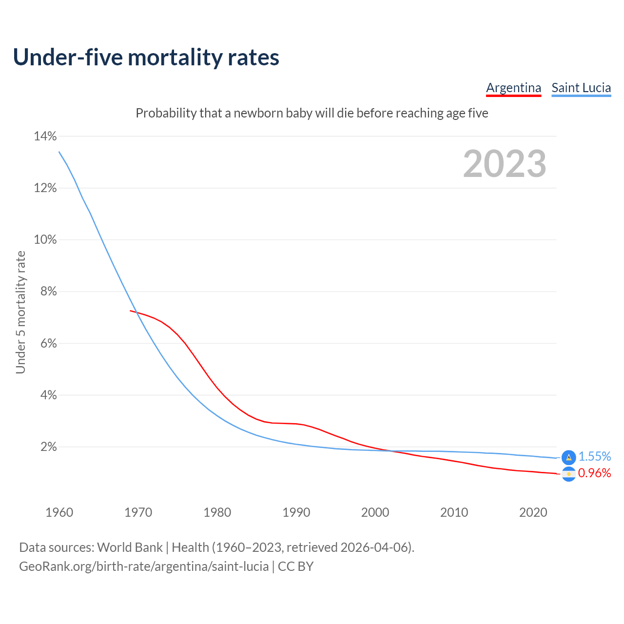 The chance that a newborn baby will die before reaching age five is 0.96% in Argentina and 1.55% in Saint Lucia. Above is a chart with historical data on under-five mortality rates.