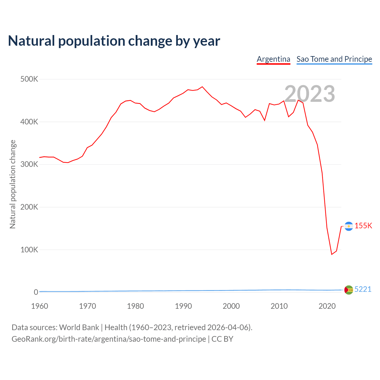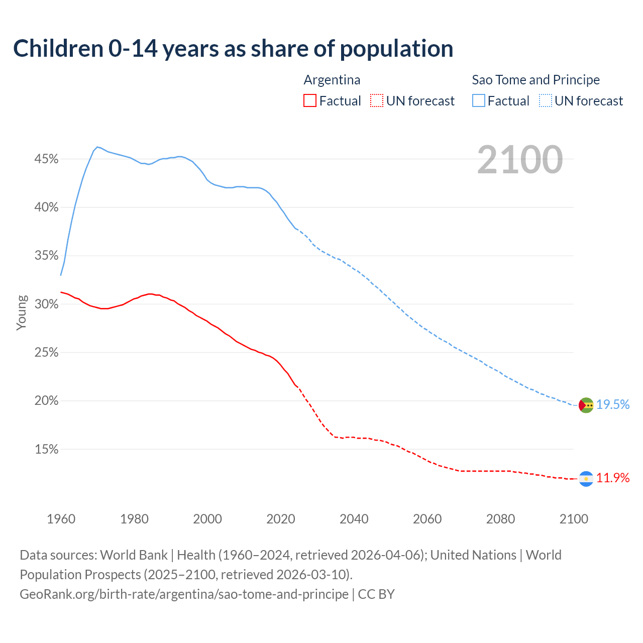 Argentina has an annual birth rate of 11.1 births per 1,000 people, compared to 28.2 for Sao Tome and Principe. The average number of children a woman is expected to have during her lifetime — the fertility rate, is 1.5 in Argentina and 3.64 in Sao Tome and Principe — 142.9% difference.