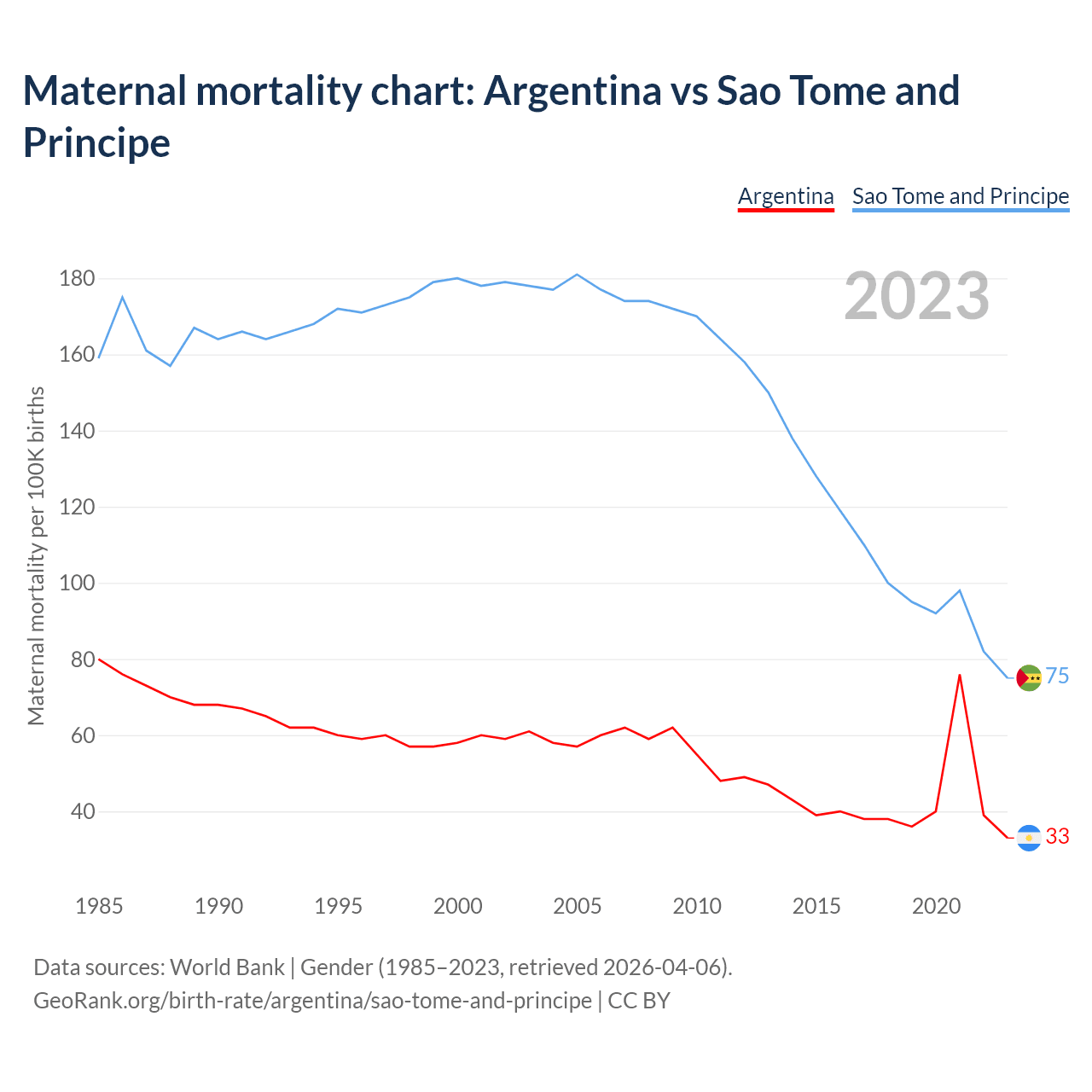 The maternal mortality rate, which is the probability of dying during childbirth or within 42 days of pregnancy termination, is 33 deaths per 100,000 live births in Argentina, compared to 75 deaths in Sao Tome and Principe.