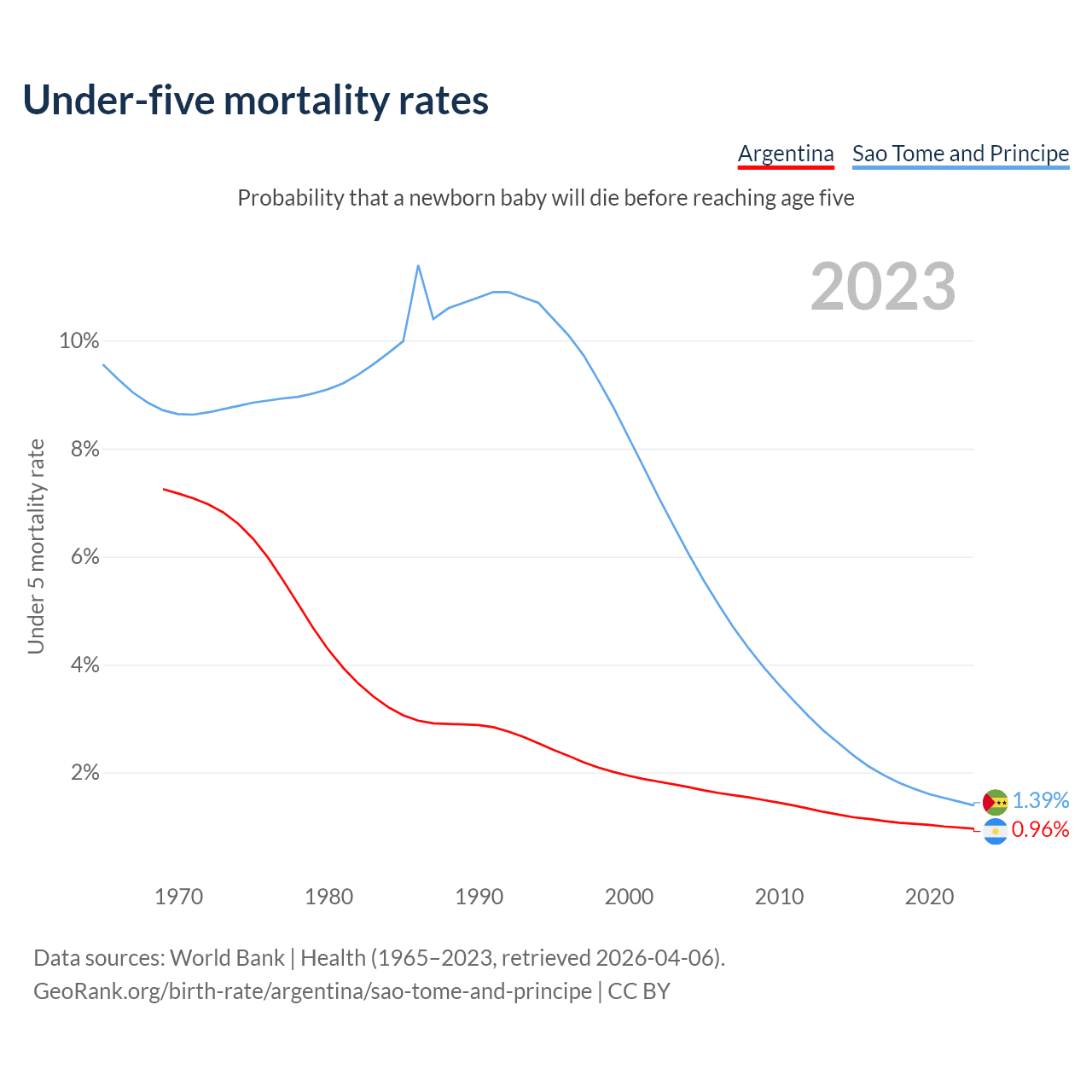 The chance that a newborn baby will die before reaching age five is 0.96% in Argentina and 1.39% in Sao Tome and Principe. Above is a chart with historical data on under-five mortality rates.