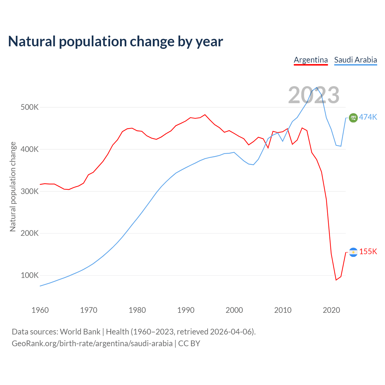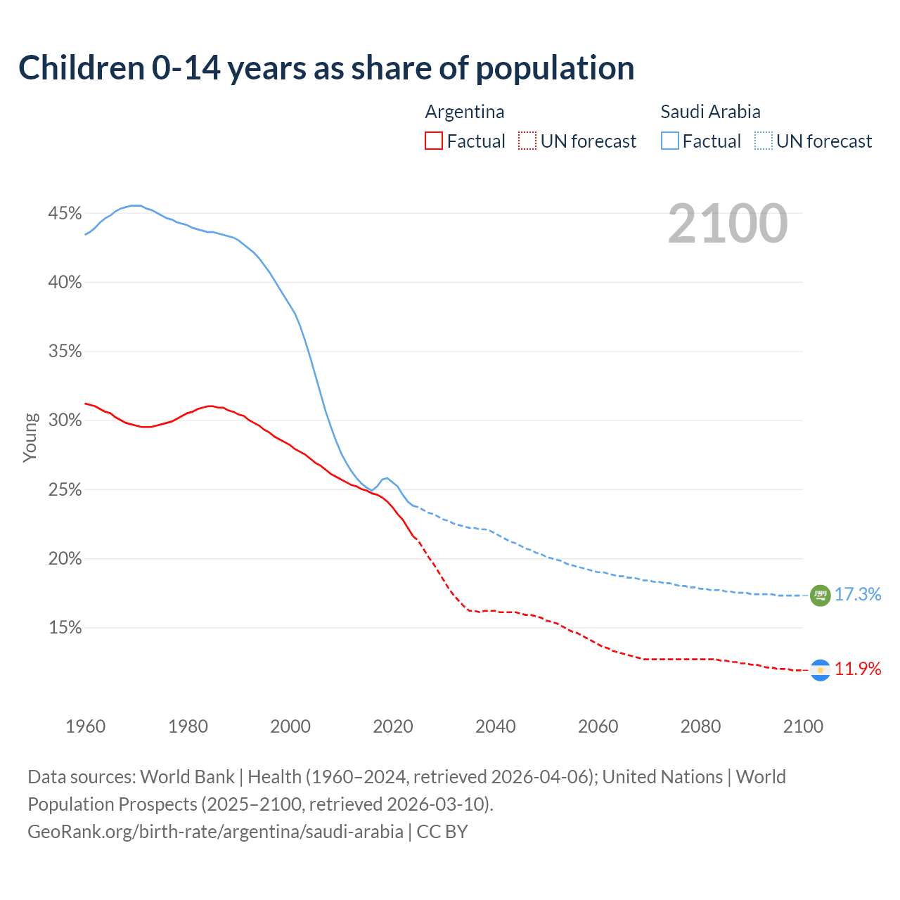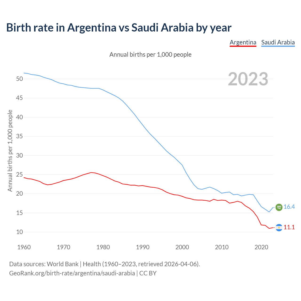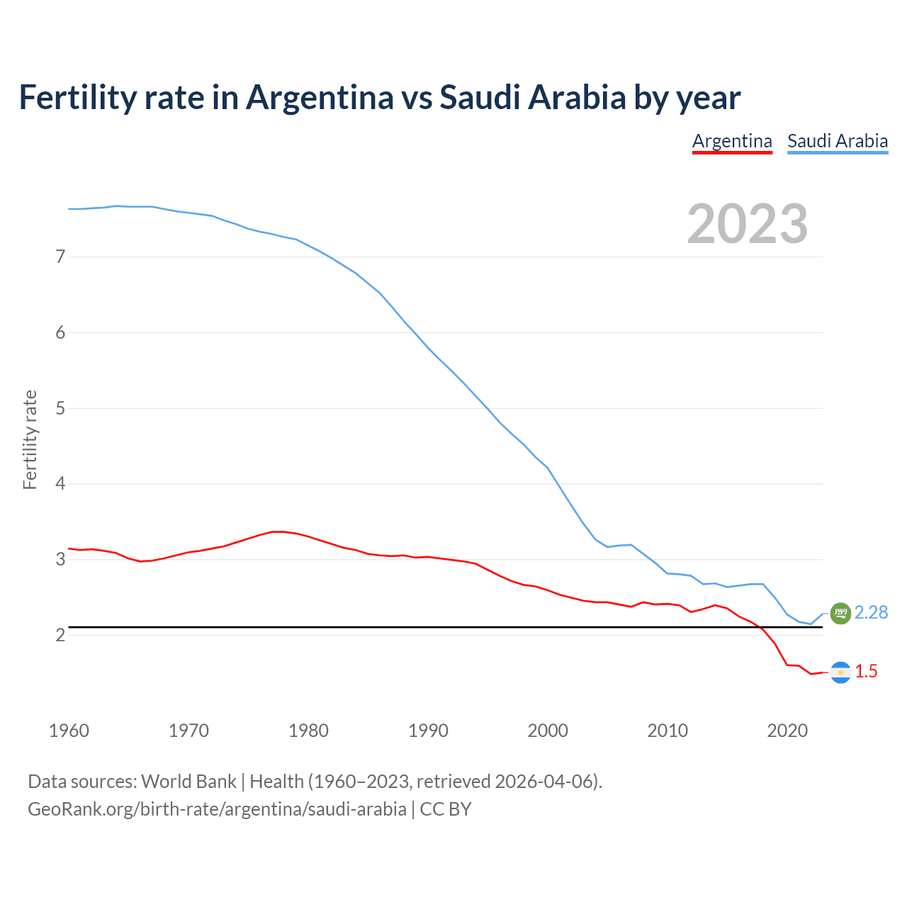 According to the latest available data on birth rates, the fertility rate in Argentina was 1.5 children per woman in 2023, compared to 2.28 in Saudi Arabia in 2023. The replacement level is considered to be 2.1 children per woman.