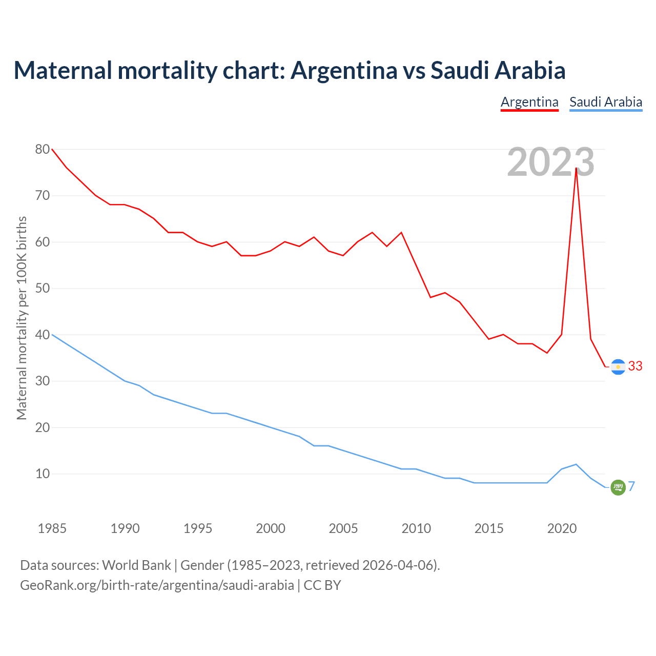 The maternal mortality rate, which is the probability of dying during childbirth or within 42 days of pregnancy termination, is 33 deaths per 100,000 live births in Argentina, compared to 7 deaths in Saudi Arabia.