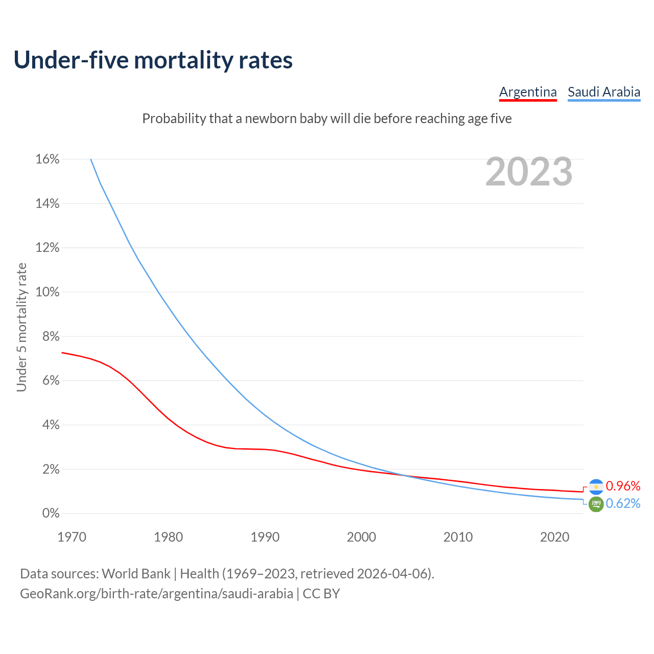 The chance that a newborn baby will die before reaching age five is 0.96% in Argentina and 0.62% in Saudi Arabia. Above is a chart with historical data on under-five mortality rates.