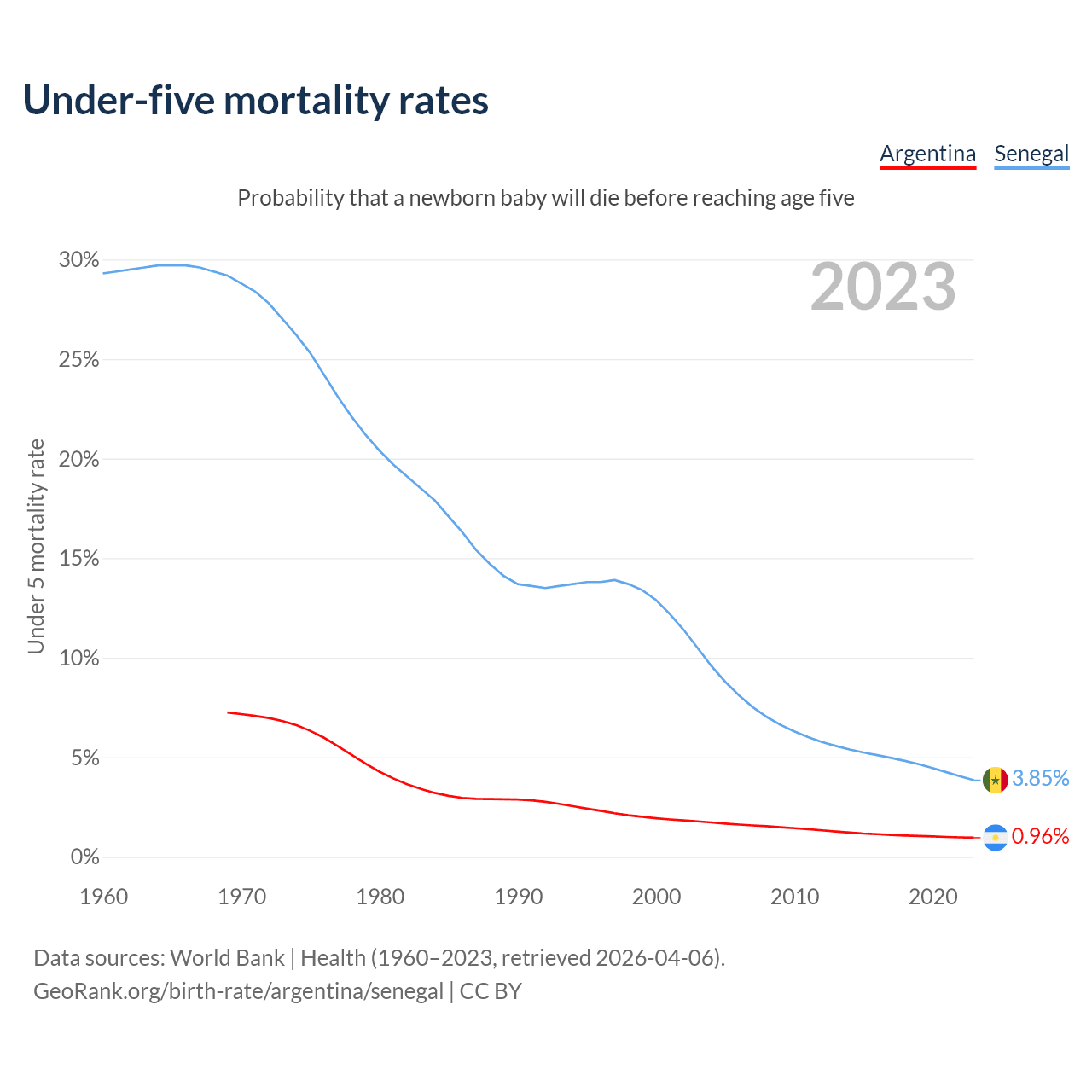 The chance that a newborn baby will die before reaching age five is 0.96% in Argentina and 3.85% in Senegal. Above is a chart with historical data on under-five mortality rates.