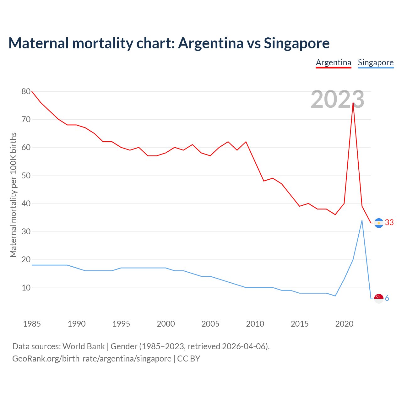 The maternal mortality rate, which is the probability of dying during childbirth or within 42 days of pregnancy termination, is 33 deaths per 100,000 live births in Argentina, compared to 6 deaths in Singapore.