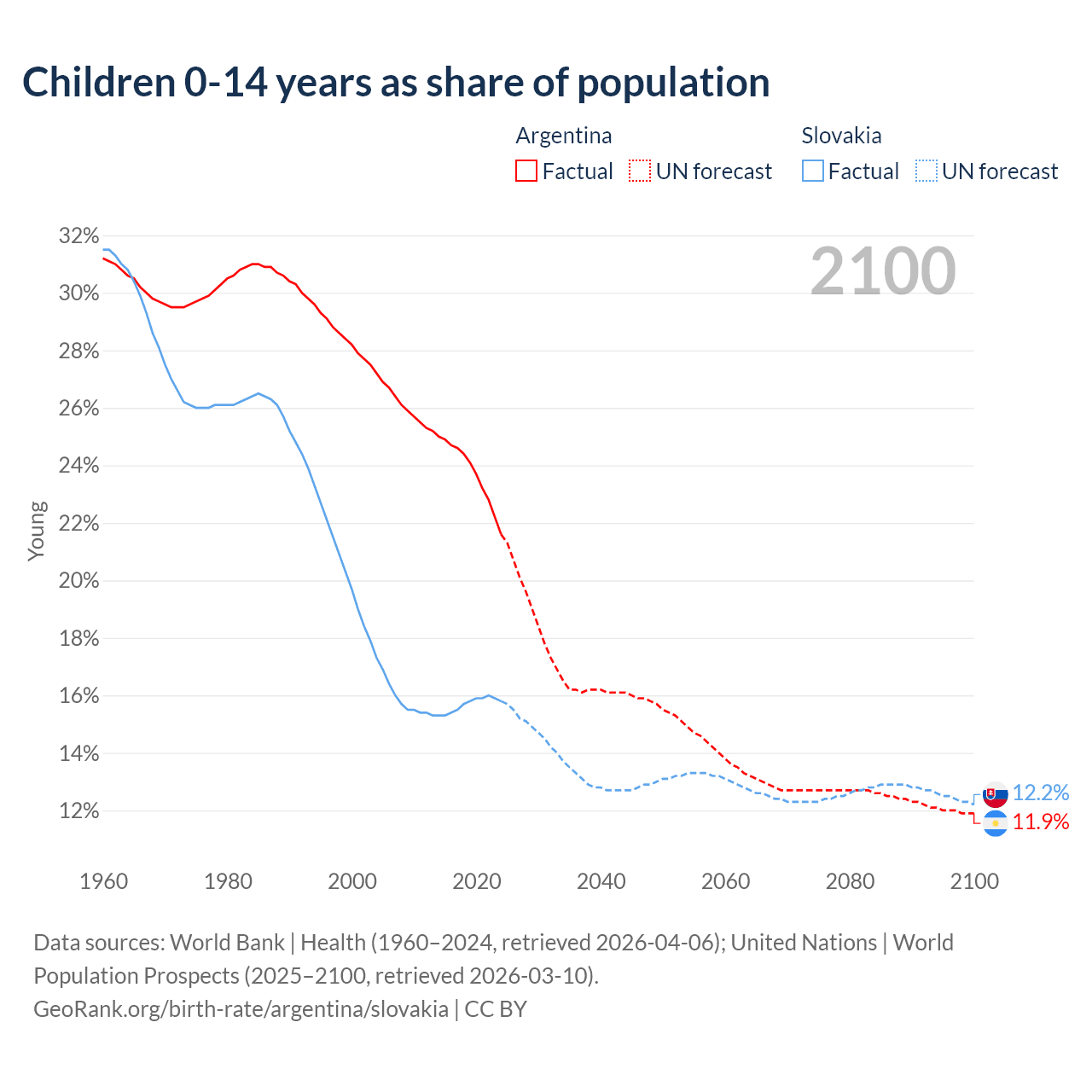 Argentina has an annual birth rate of 11.1 births per 1,000 people, compared to 9 for Slovakia. The average number of children a woman is expected to have during her lifetime — the fertility rate, is 1.5 in Argentina and 1.49 in Slovakia — 0.67% difference.