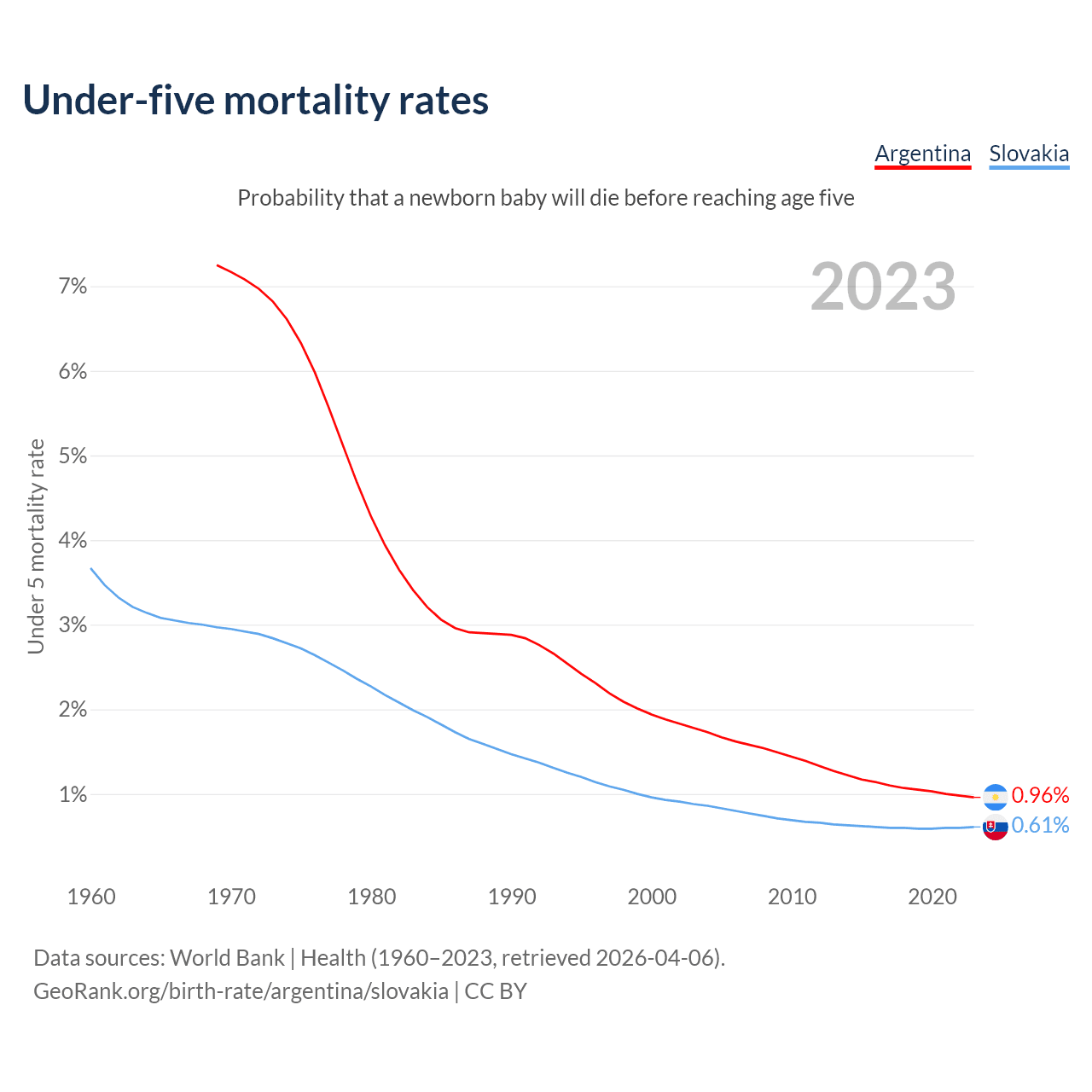 The chance that a newborn baby will die before reaching age five is 0.96% in Argentina and 0.61% in Slovakia. Above is a chart with historical data on under-five mortality rates.