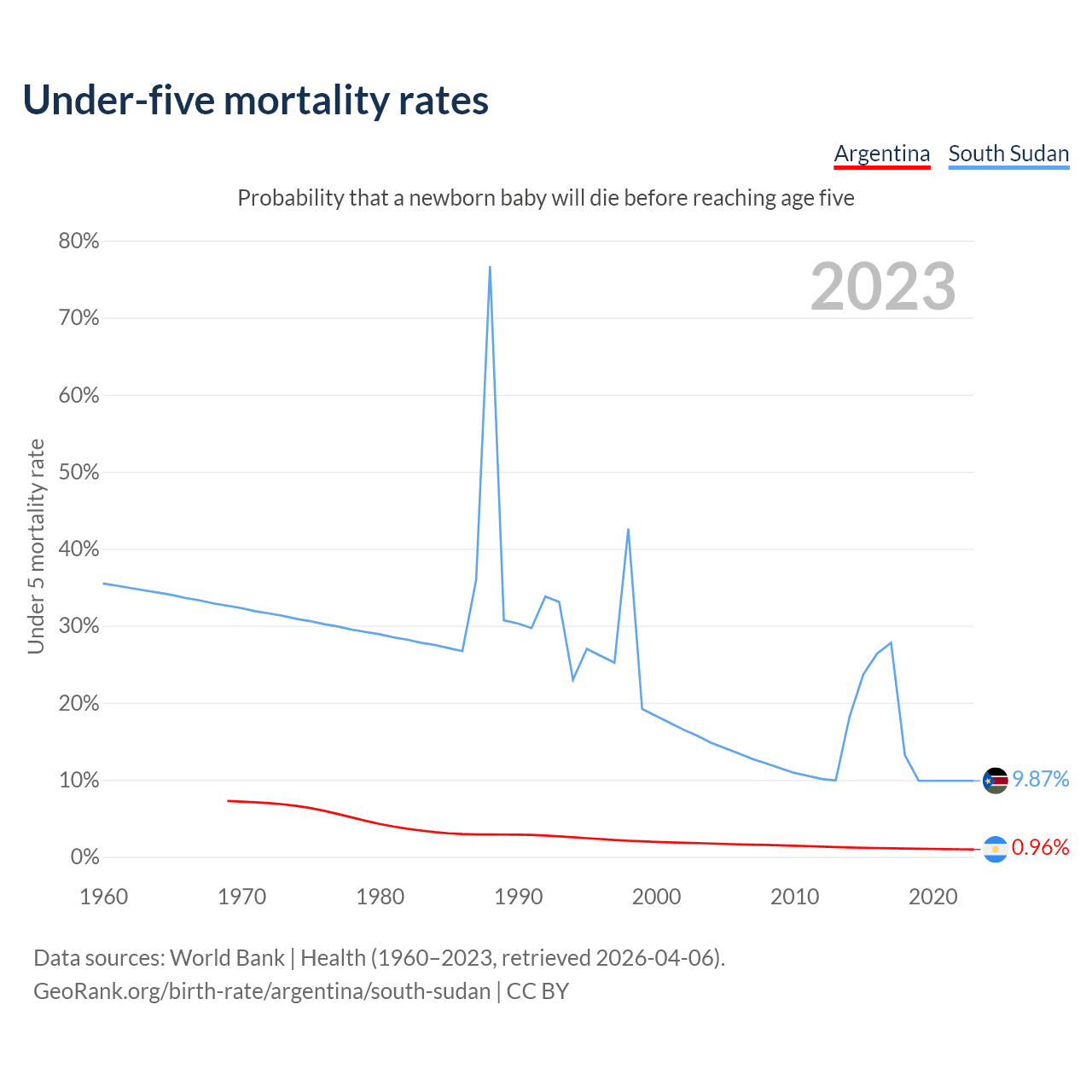 The chance that a newborn baby will die before reaching age five is 0.96% in Argentina and 9.87% in South Sudan. Above is a chart with historical data on under-five mortality rates.