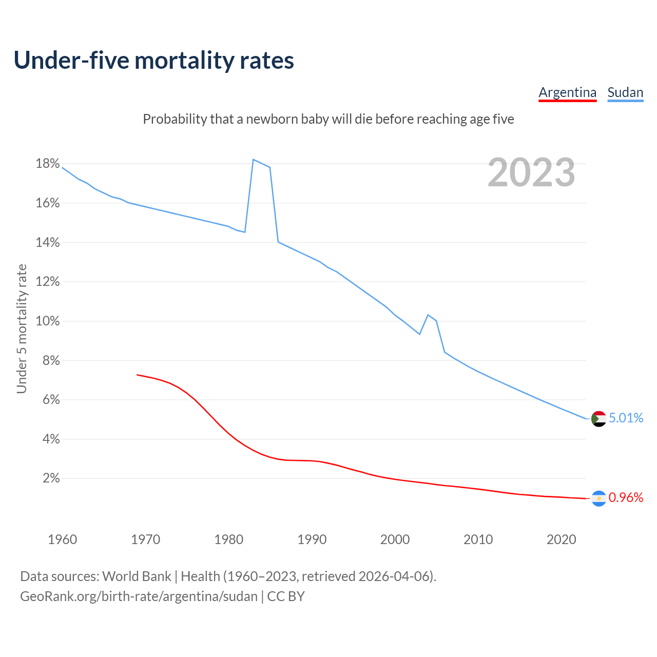 The chance that a newborn baby will die before reaching age five is 0.96% in Argentina and 5.01% in Sudan. Above is a chart with historical data on under-five mortality rates.