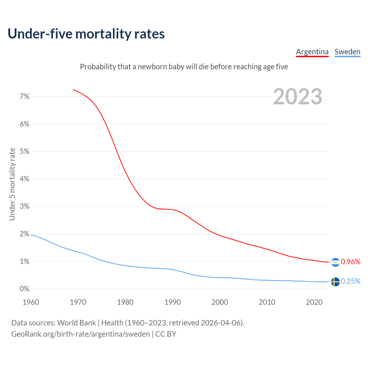 The chance that a newborn baby will die before reaching age five is 0.96% in Argentina and 0.25% in Sweden. Above is a chart with historical data on under-five mortality rates.