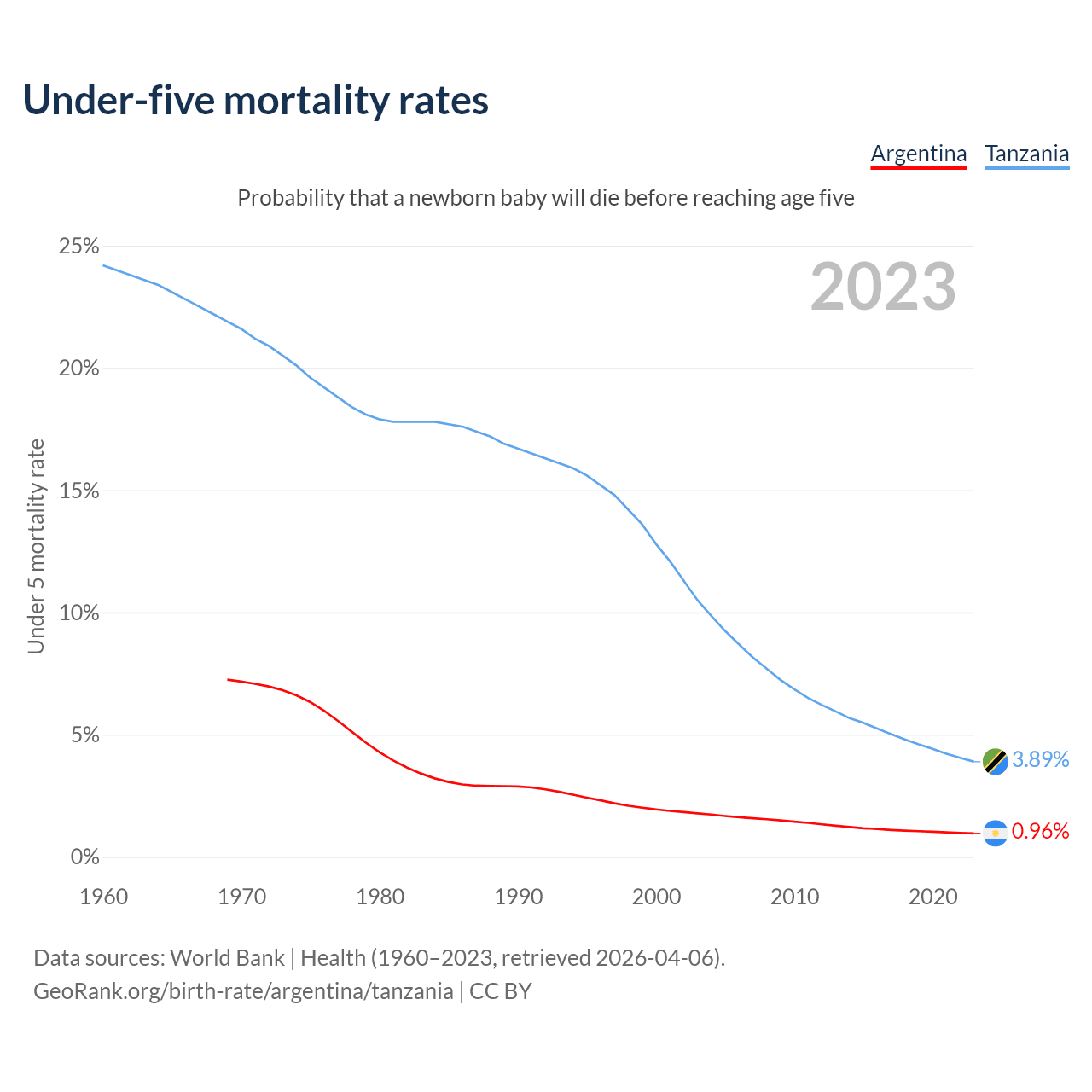The chance that a newborn baby will die before reaching age five is 0.96% in Argentina and 3.89% in Tanzania. Above is a chart with historical data on under-five mortality rates.
