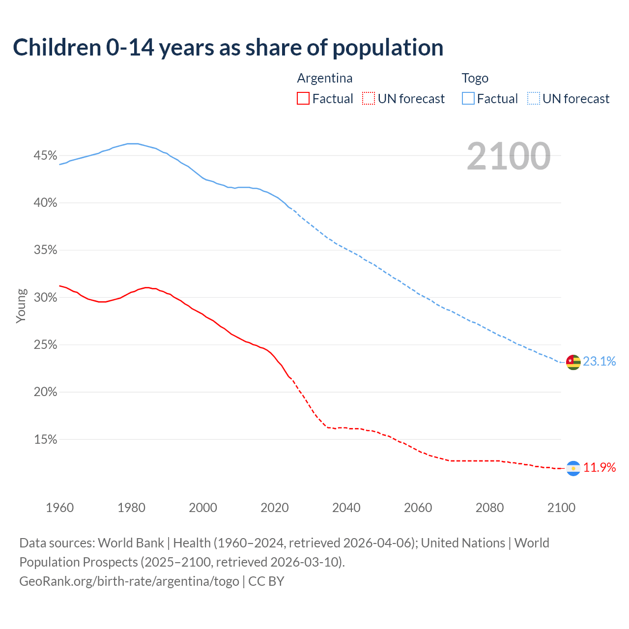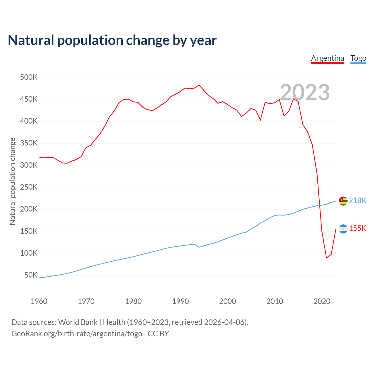 Argentina has an annual birth rate of 11.1 births per 1,000 people, compared to 31.1 for Togo. The average number of children a woman is expected to have during her lifetime — the fertility rate, is 1.5 in Argentina and 4.19 in Togo — 179.5% difference.