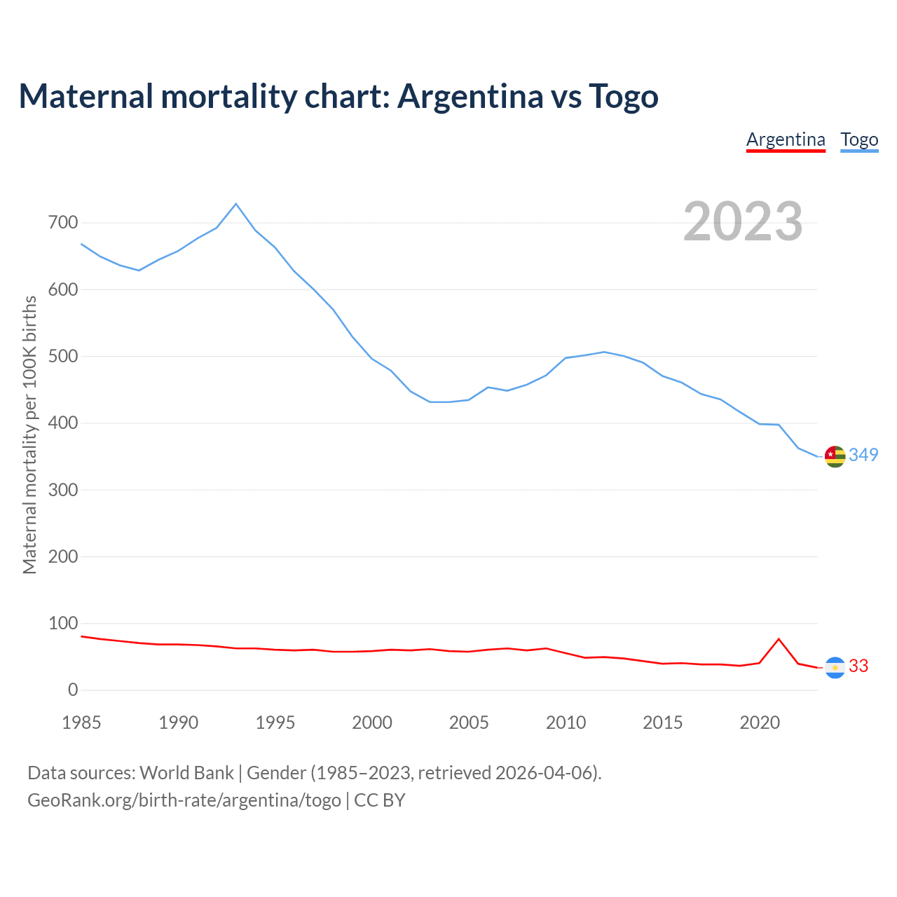 The maternal mortality rate, which is the probability of dying during childbirth or within 42 days of pregnancy termination, is 33 deaths per 100,000 live births in Argentina, compared to 349 deaths in Togo.
