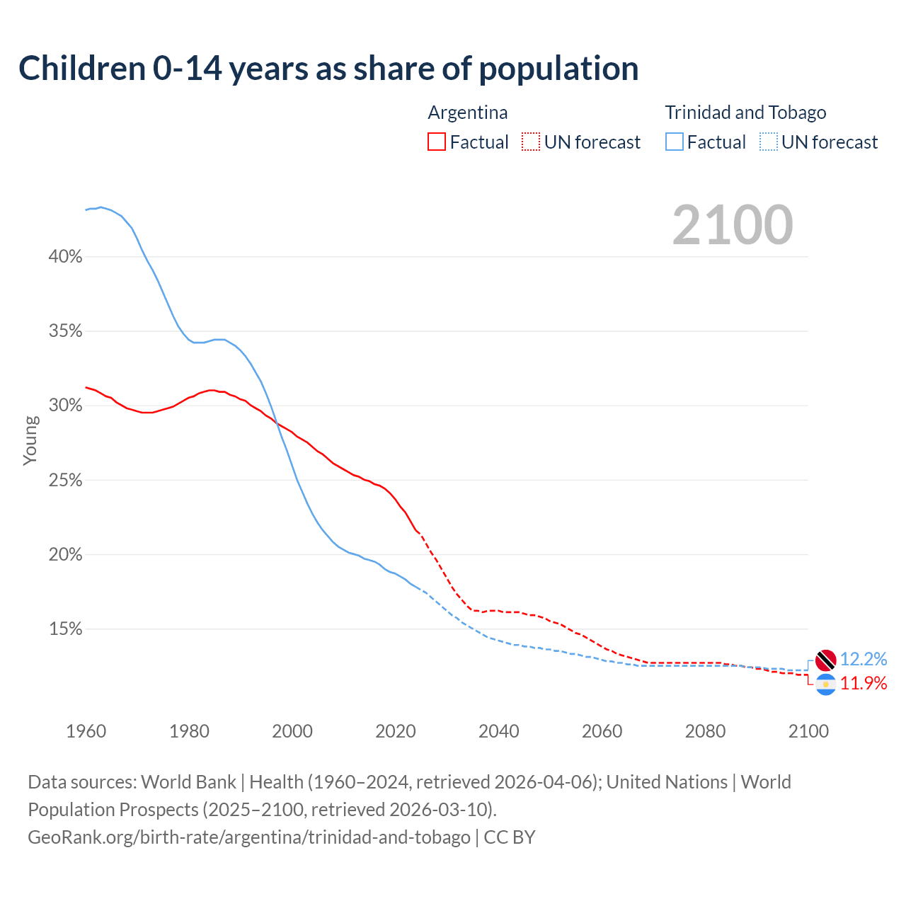 According to the latest available data on birth rates, the fertility rate in Argentina was 1.5 children per woman in 2023, compared to 1.53 in Trinidad and Tobago in 2023. The replacement level is considered to be 2.1 children per woman.