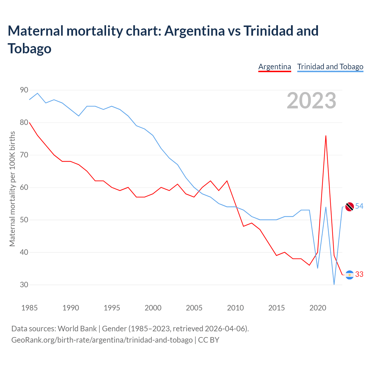 The maternal mortality rate, which is the probability of dying during childbirth or within 42 days of pregnancy termination, is 33 deaths per 100,000 live births in Argentina, compared to 54 deaths in Trinidad and Tobago.