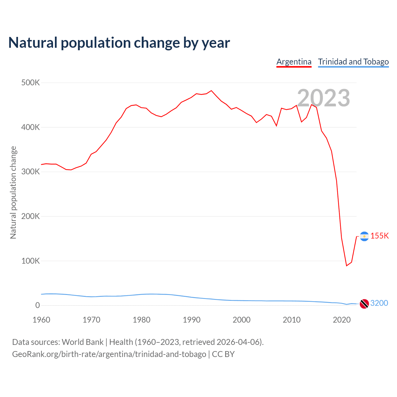 Argentina has an annual birth rate of 11.1 births per 1,000 people, compared to 10.7 for Trinidad and Tobago. The average number of children a woman is expected to have during her lifetime — the fertility rate, is 1.5 in Argentina and 1.53 in Trinidad and Tobago — 2.13% difference.