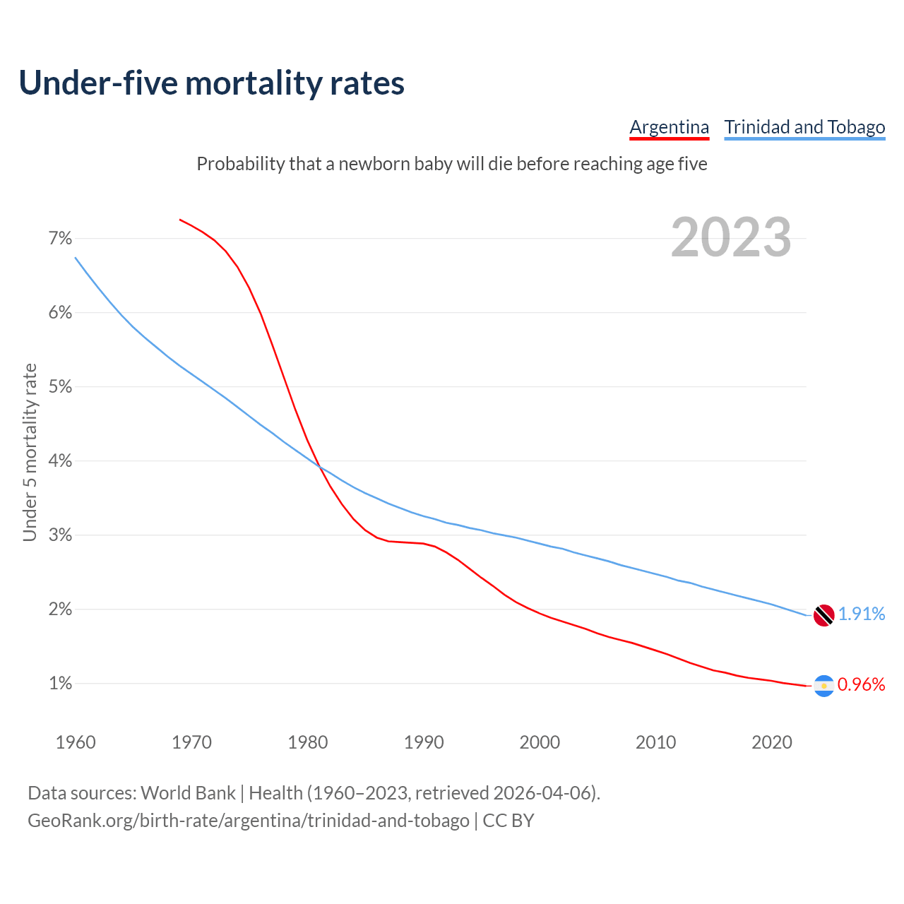 The chance that a newborn baby will die before reaching age five is 0.96% in Argentina and 1.91% in Trinidad and Tobago. Above is a chart with historical data on under-five mortality rates.