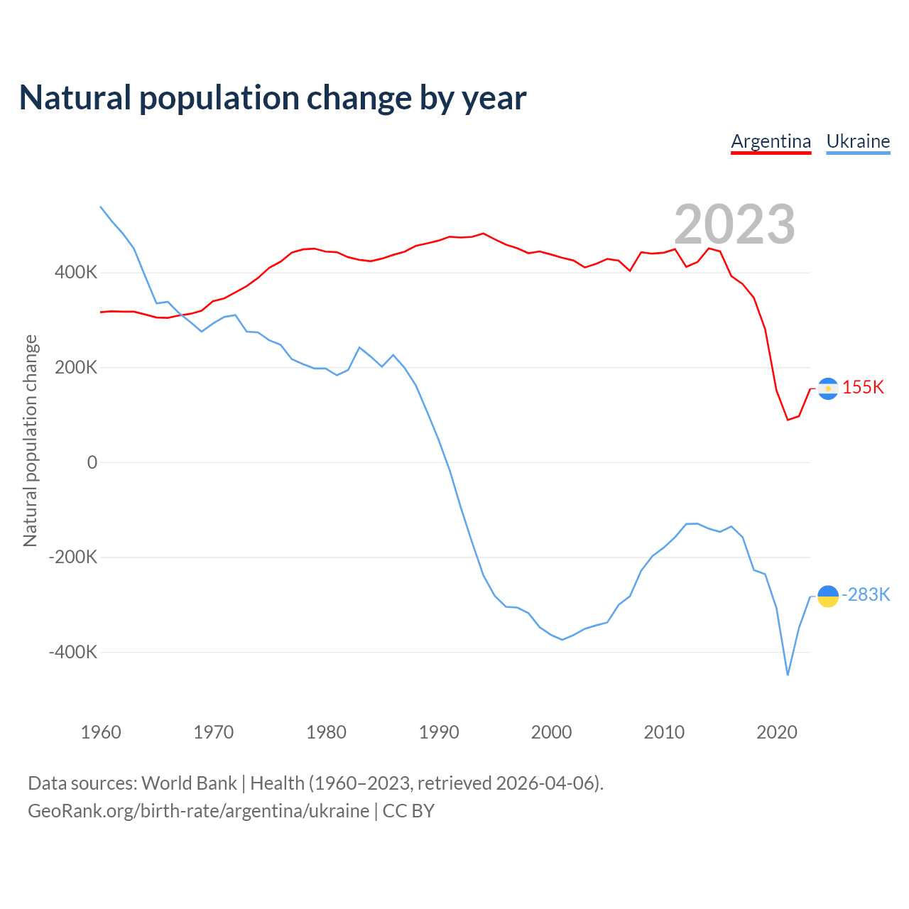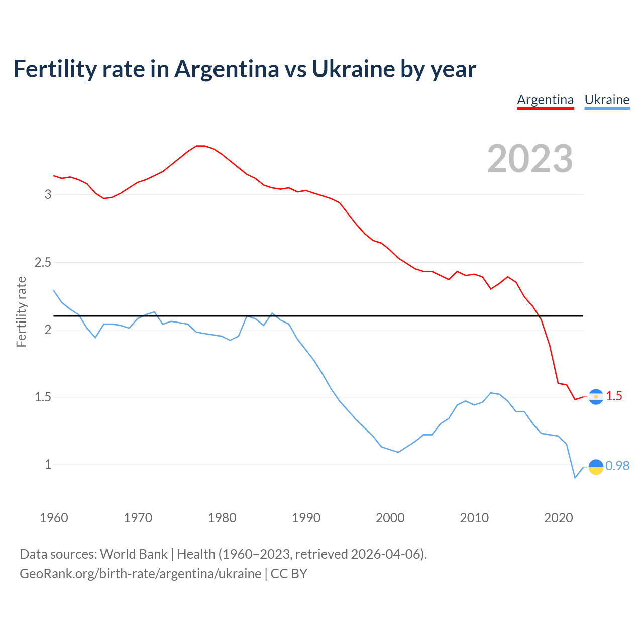 According to the latest available data on birth rates, the fertility rate in Argentina was 1.5 children per woman in 2023, compared to 0.98 in Ukraine in 2023. The replacement level is considered to be 2.1 children per woman.