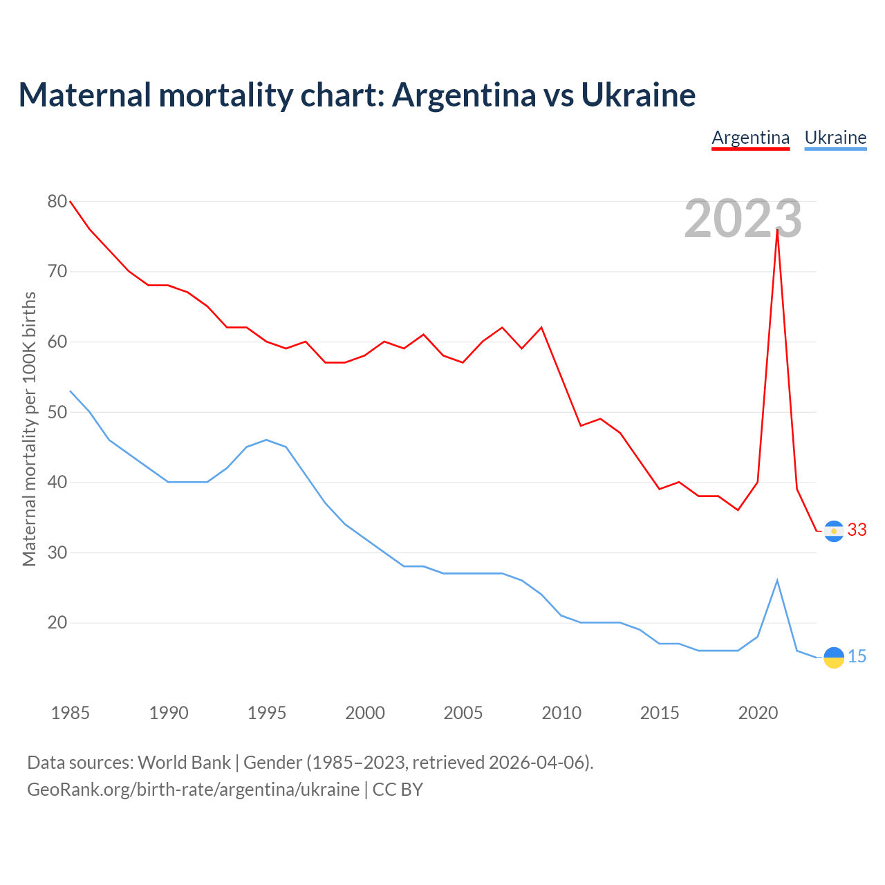 The maternal mortality rate, which is the probability of dying during childbirth or within 42 days of pregnancy termination, is 33 deaths per 100,000 live births in Argentina, compared to 15 deaths in Ukraine.