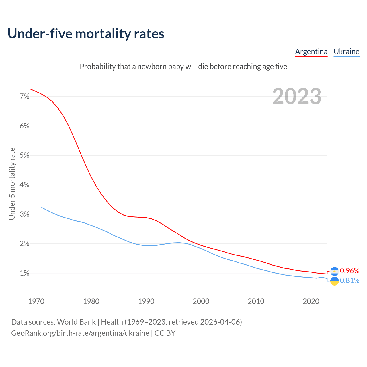 The chance that a newborn baby will die before reaching age five is 0.96% in Argentina and 0.81% in Ukraine. Above is a chart with historical data on under-five mortality rates.