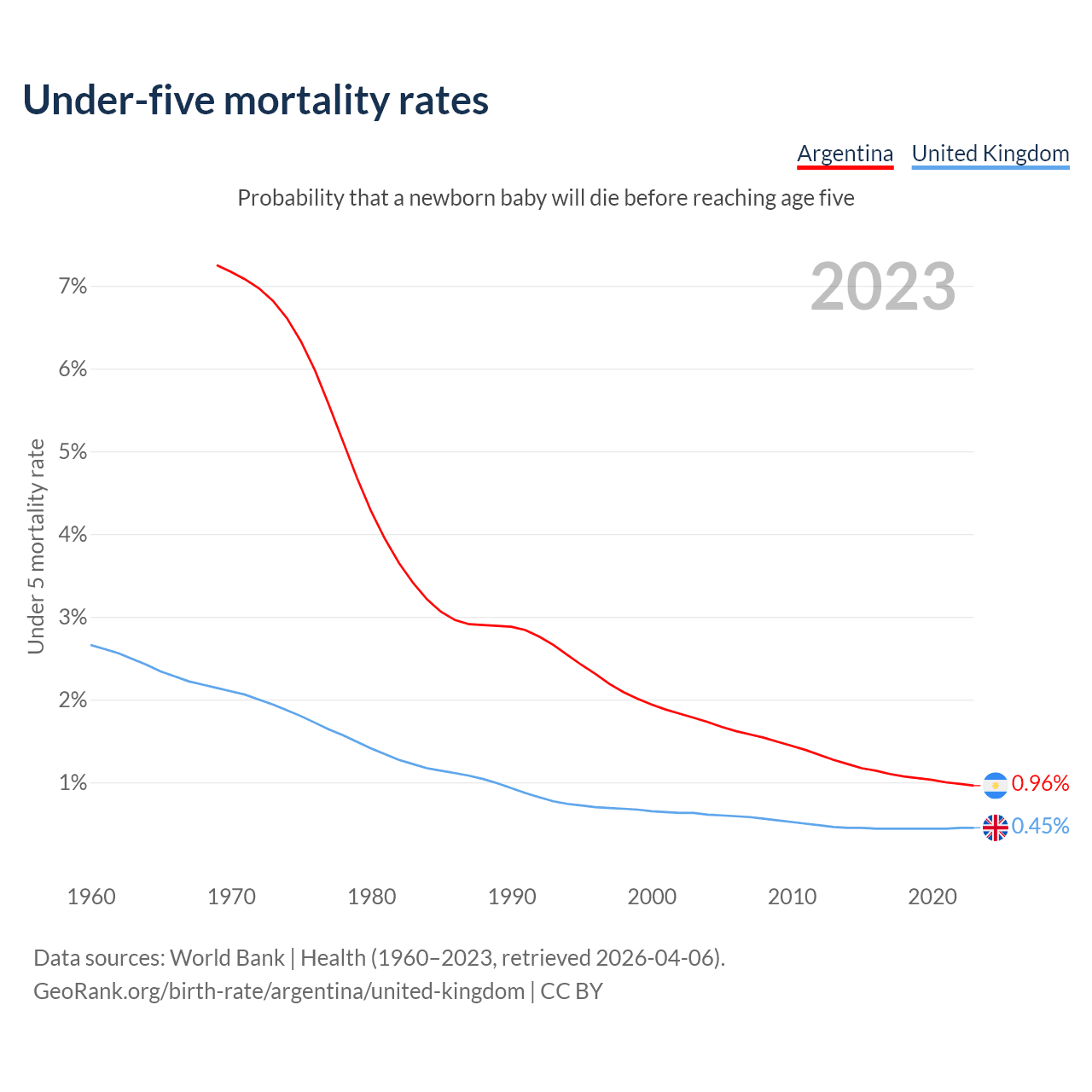 The chance that a newborn baby will die before reaching age five is 0.96% in Argentina and 0.45% in the United Kingdom. Above is a chart with historical data on under-five mortality rates.