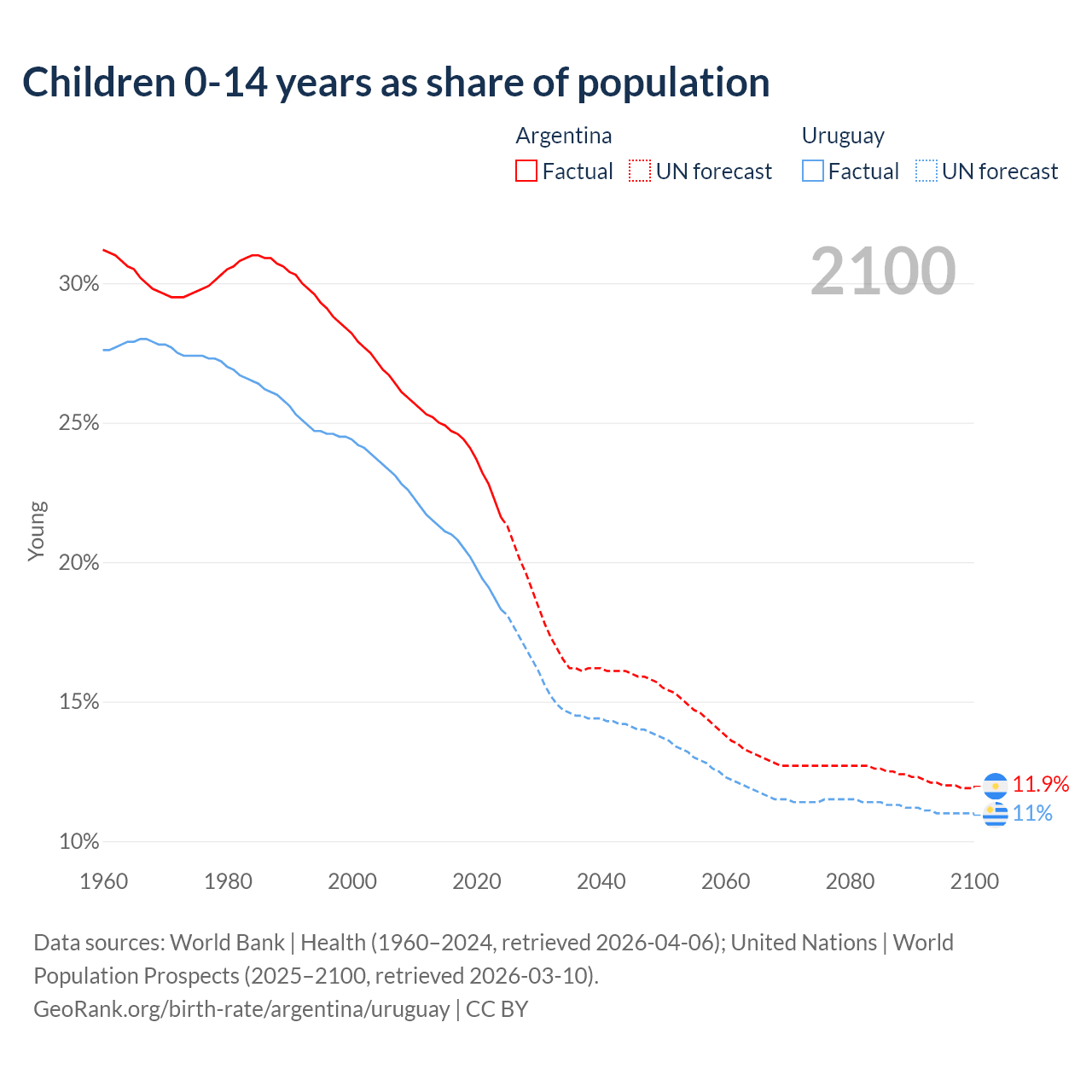 According to the latest available data on birth rates, the fertility rate in Argentina was 1.5 children per woman in 2023, compared to 1.41 in Uruguay in 2023. The replacement level is considered to be 2.1 children per woman.